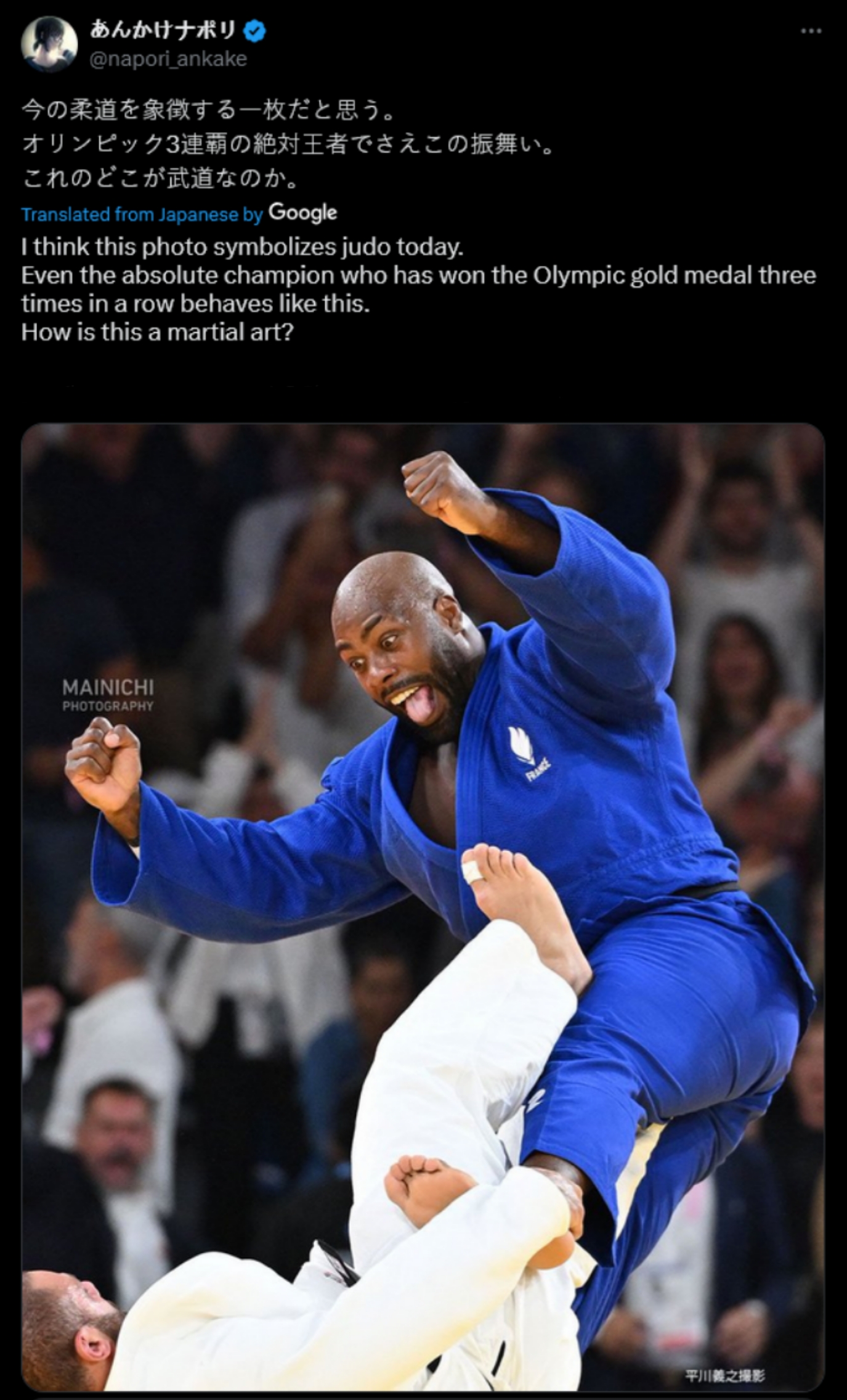 >>153107630you are shamefully lyingteddy won by a ippon fair and squarethe picture is actually showing the georgian making him fall out of spite directly after the ippon, and he then tried intimidating him because he's a sore loserteddy riner had the most mature response, he kept his honor by not getting into a fight when he could have absolutely destroyed his ass, he is more respectful of judo's bushido than you ever will befrance has dethroned japan, the student has surpassed the teacher and now all you can do is cry about it
