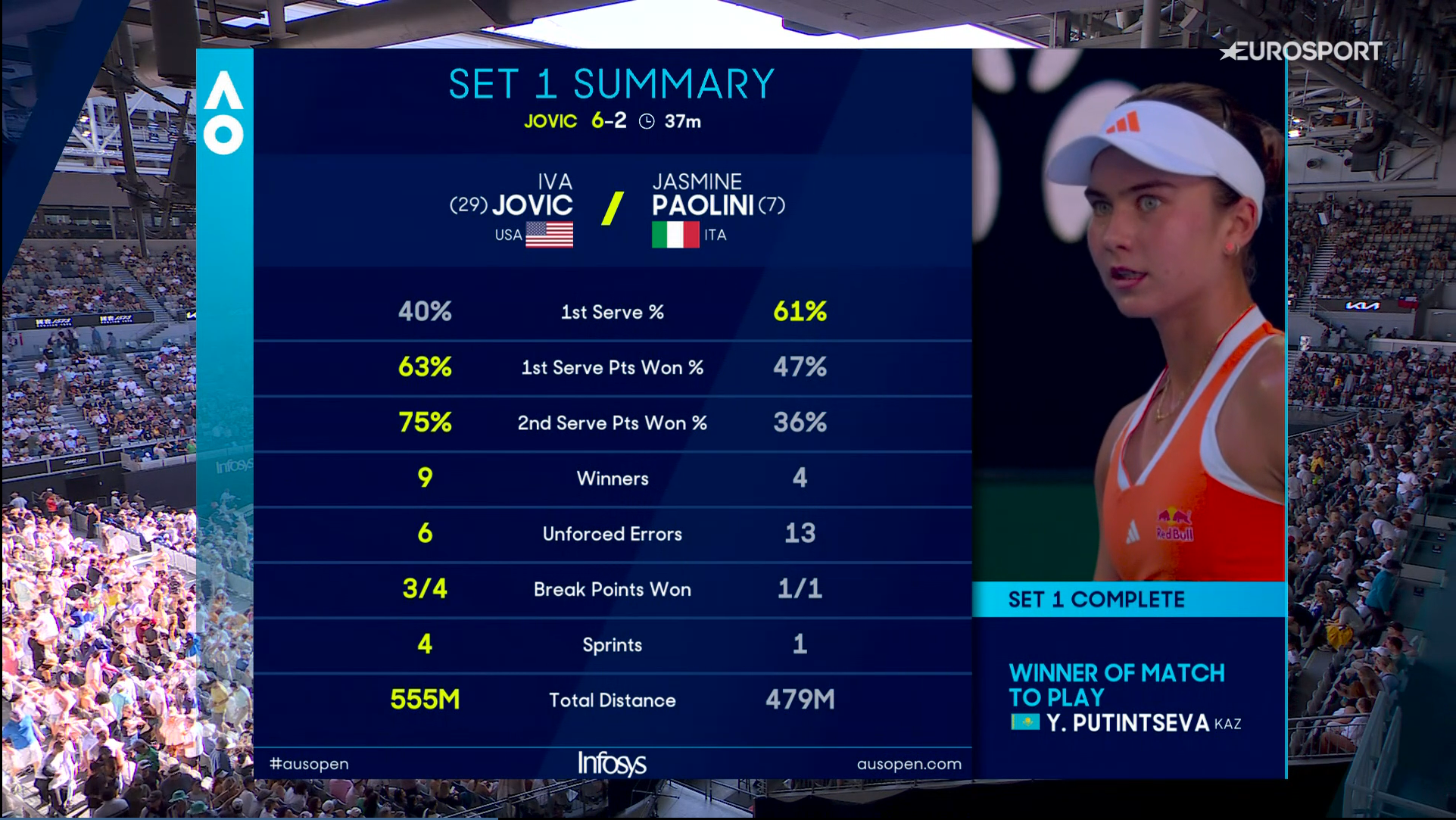 Ah so that's why the match seemed subdued. Paolini losing and the wop crowd are also subdued. Paolini finally holds onto her serve and they cheer. Not a lot of love for Jovic from the Aussies it seems, is it because of the flag?