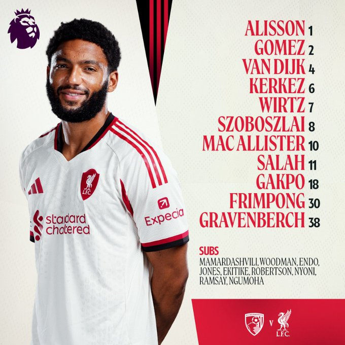AlissonFrimpongGomezVirgilKerkezGravenberchMac AllisterWirtzSzoboszlaiSalahGakpoBournemouth: IRREELEVANT. SHIT.