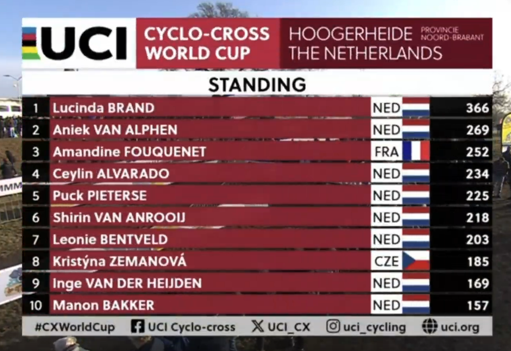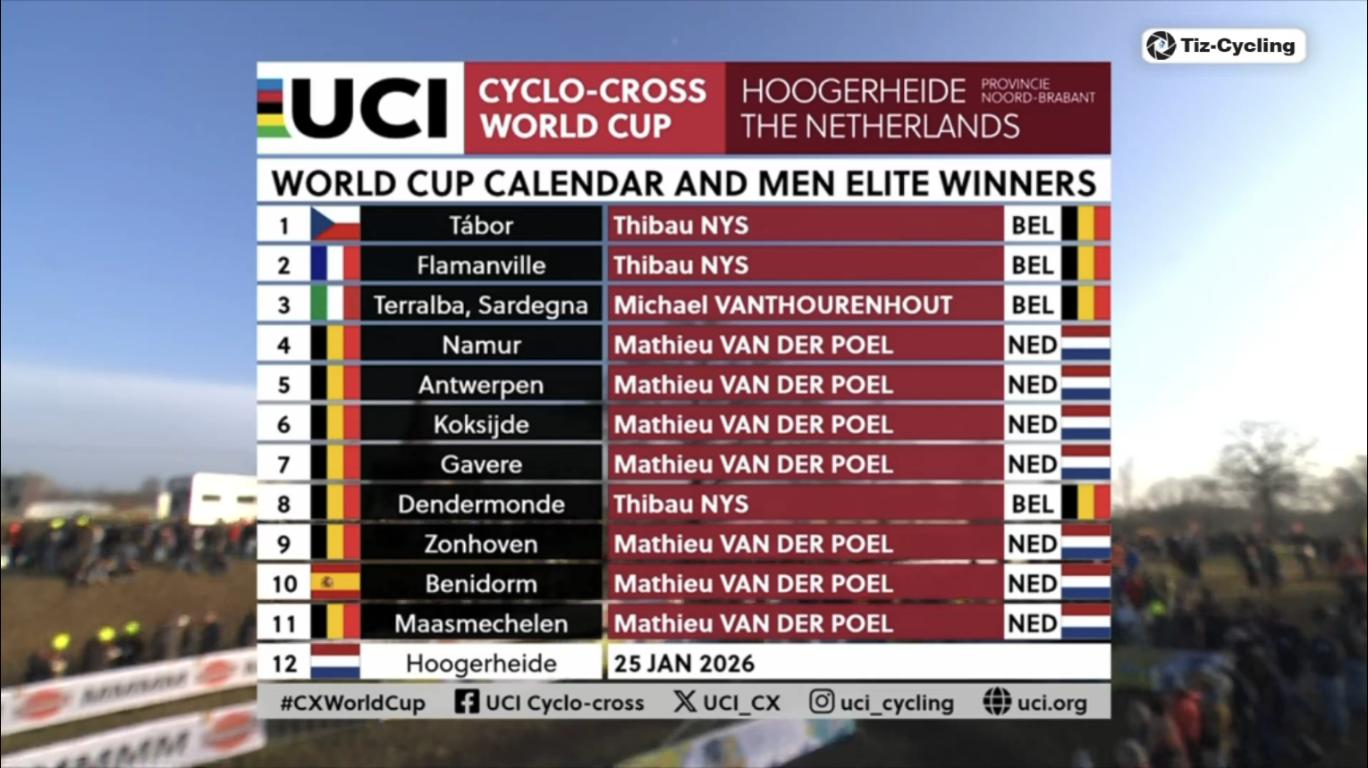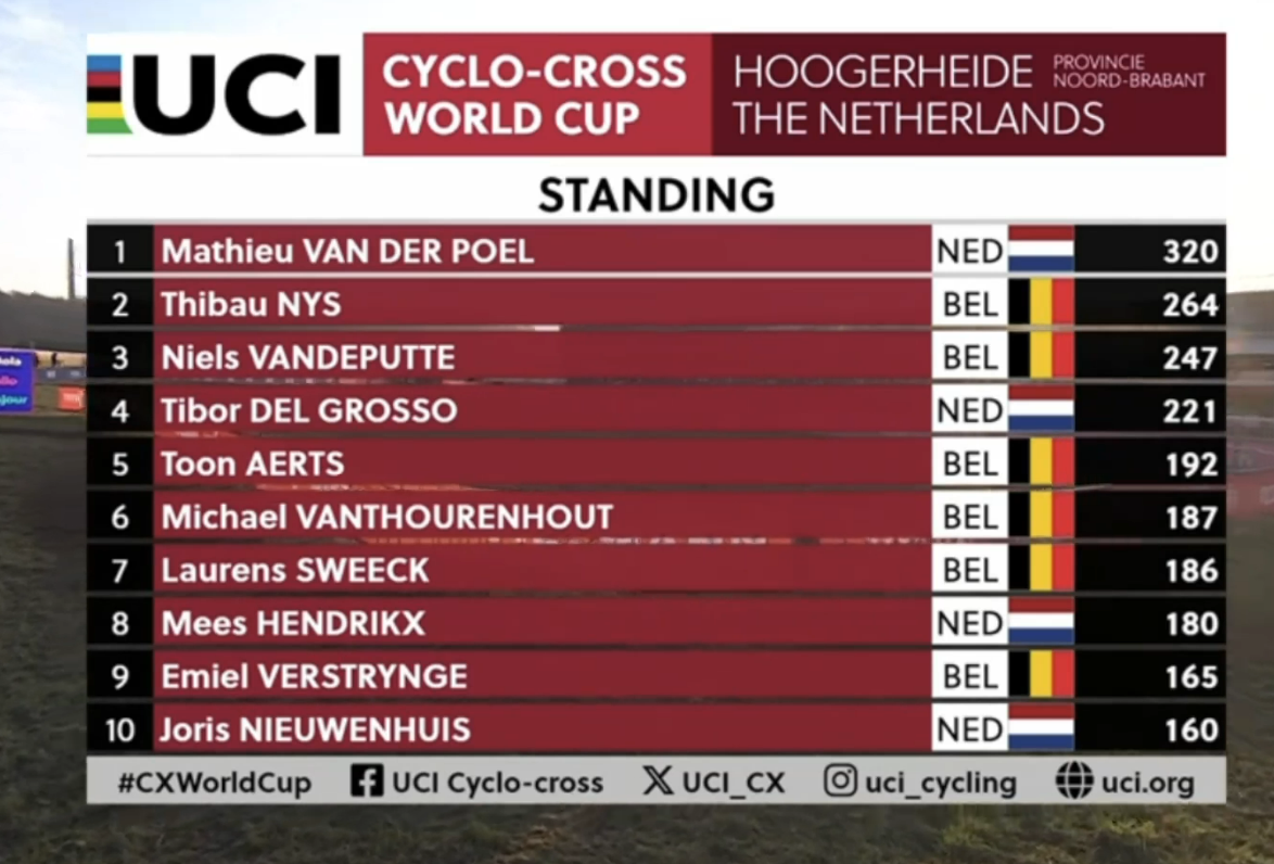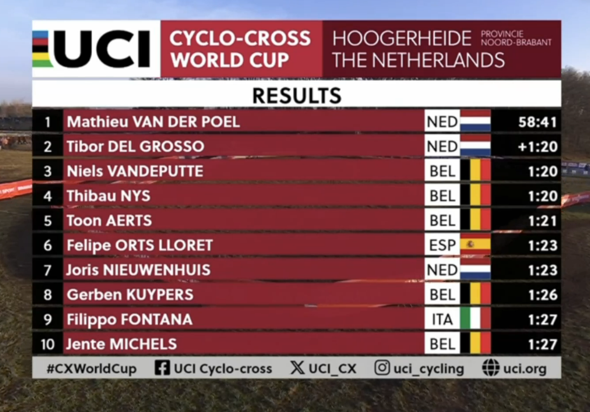 UCI World Cup Hoogerheide 2026 (CDM)Round #12 final13:40 CET Women Elite Startlist: https://www.ucicyclocrossworldcup.com/storage/programs/file_participants/556/556.pdfLive stats: https://cx.procyclingstats.com/race/gp-adrie-van-der-poel/2026/WE/live15:10 CET Men EliteStartlist: https://www.ucicyclocrossworldcup.com/storage/programs/file_participants/557/557.pdfLive stats: https://cx.procyclingstats.com/race/gp-adrie-van-der-poel/2026/ME/live Standings:https://cyclocross24.com/standings/uci-world-cup/Streams:https://www.youtube.com/user/ucichannel/livehttps://tiz-cycling-live.io/https://dlhd.dad/Eurosport / Discovery+ / HBO / TNT / L'Equipe / NOS / Rai / RTVE / Telenet / Proximus / Flobikes