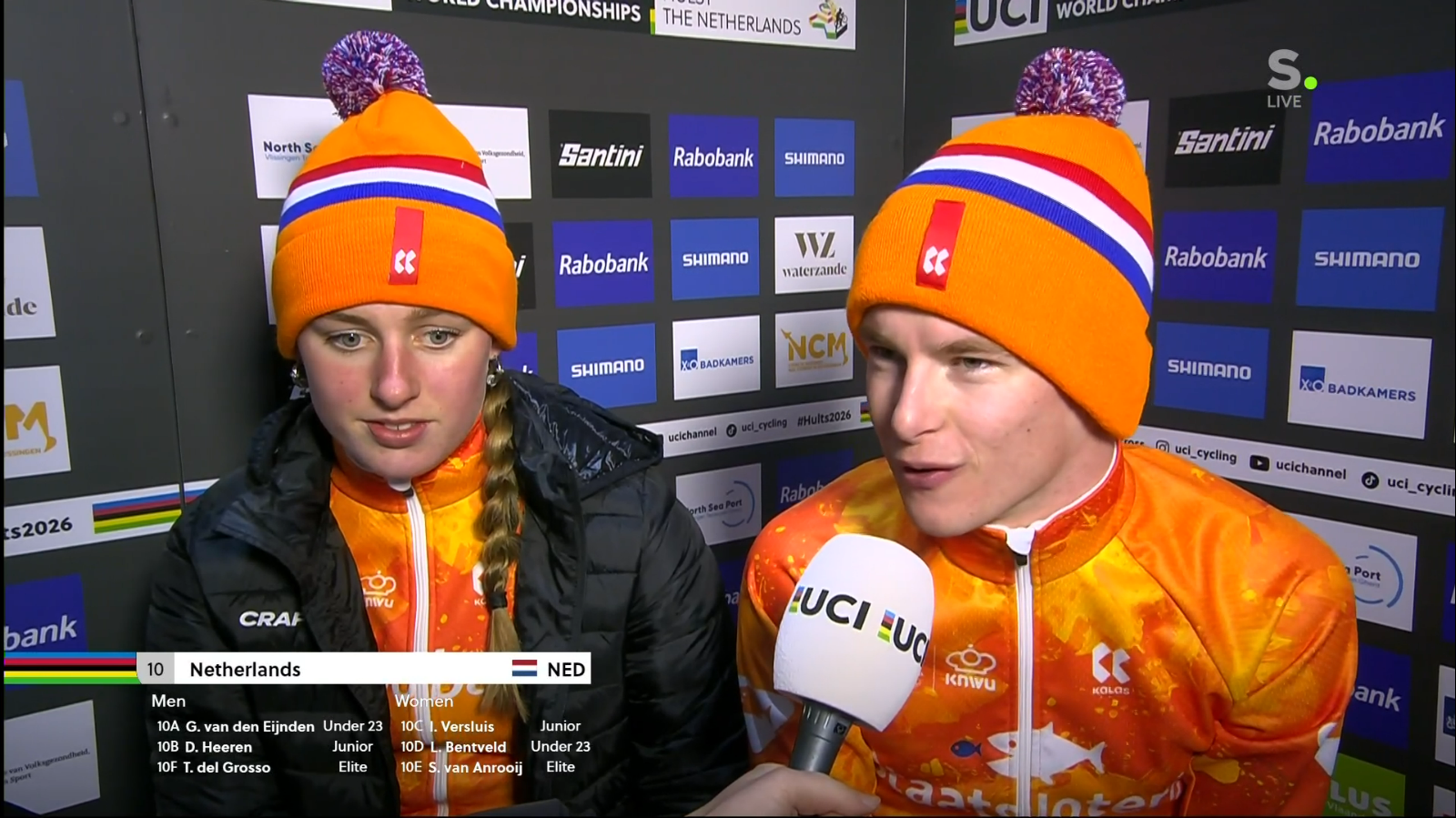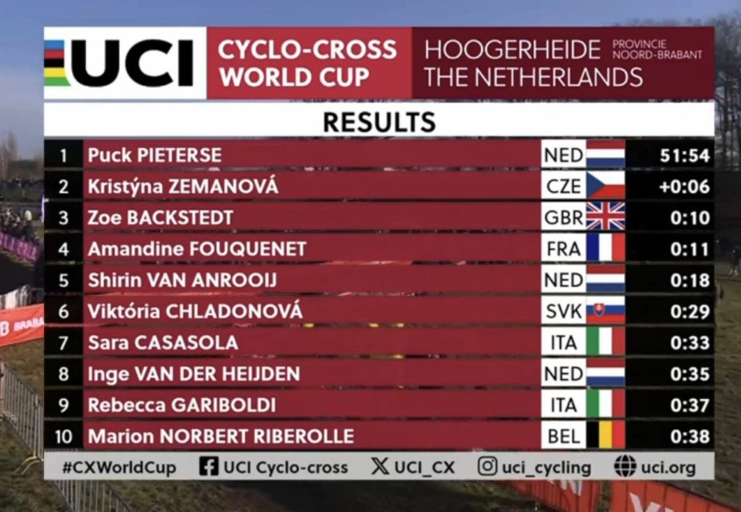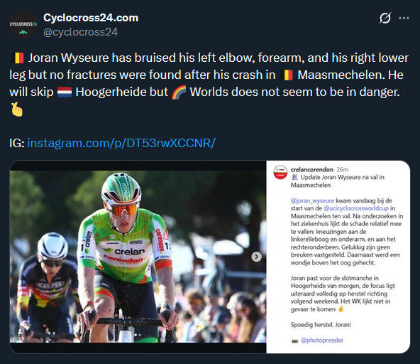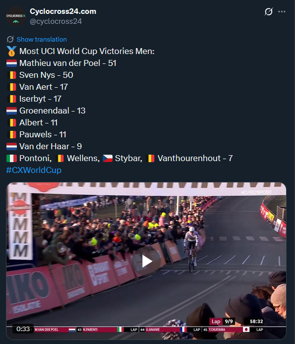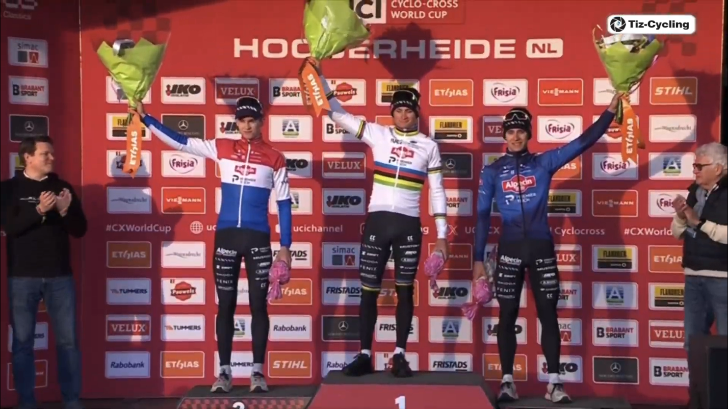 UCI World Cup Hoogerheide 2026 (CDM)Round #12 final13:40 CET Women Elite Startlist: https://www.ucicyclocrossworldcup.com/storage/programs/file_participants/556/556.pdfLive stats: https://cx.procyclingstats.com/race/gp-adrie-van-der-poel/2026/WE/live15:10 CET Men EliteStartlist: https://www.ucicyclocrossworldcup.com/storage/programs/file_participants/557/557.pdfLive stats: https://cx.procyclingstats.com/race/gp-adrie-van-der-poel/2026/ME/live Standings:https://cyclocross24.com/standings/uci-world-cup/Streams:https://www.youtube.com/user/ucichannel/livehttps://tiz-cycling-live.io/https://dlhd.dad/Eurosport / Discovery+ / HBO / TNT / L'Equipe / NOS / Rai / RTVE / Telenet / Proximus / Flobikes
