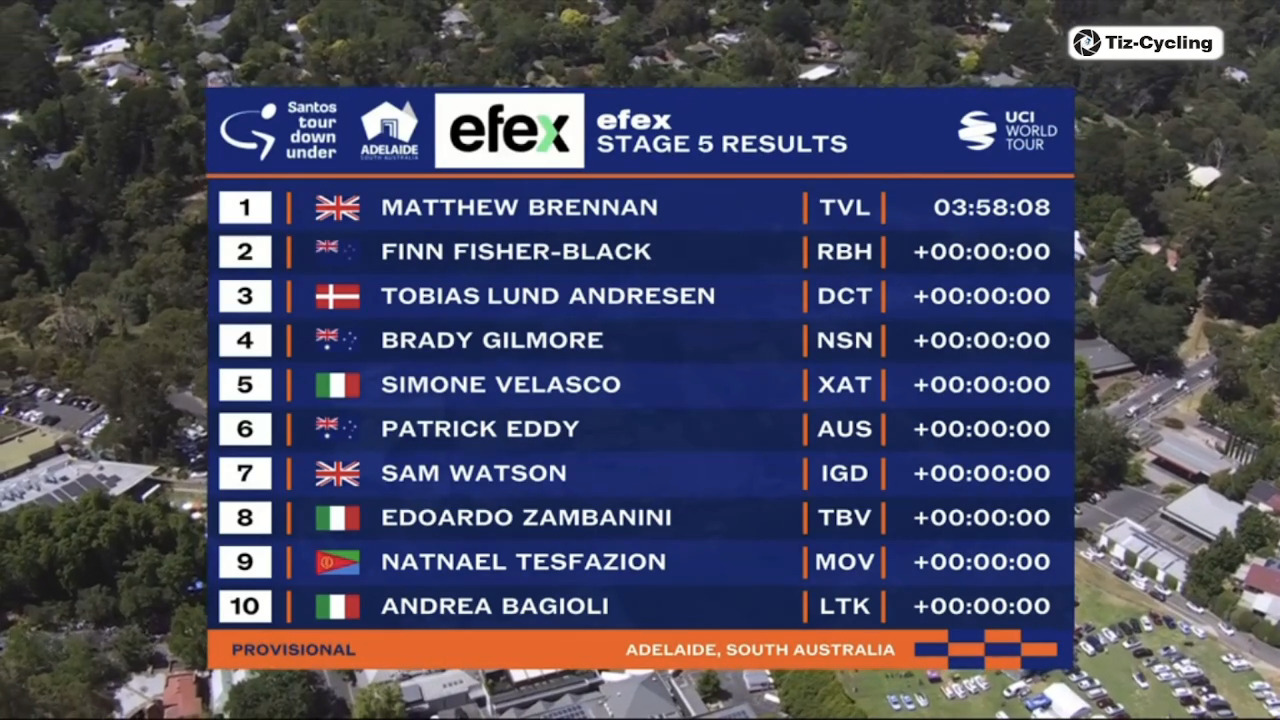 Santos Tour Down Under (2.UWT)Stage 5 (Final)Stirling - Stirling169.8kmStartlist:https://www.procyclingstats.com/race/tour-down-under/2026/startlistGC after stage 4:https://www.procyclingstats.com/race/tour-down-under/2026/stage-4-gcRoadbook:https://www.xoo-cycling.ch/download/roadbooks/roadbook_tour-down-under_2026.pdfLive stats:https://www.procyclingstats.com/race/tour-down-under/2026/stage-5/liveStreams:https://cyclingtiz.live/https://dlhd.dad/Eurosport / Discovery+ / HBO / TNT / L'Equipe01:50 CET