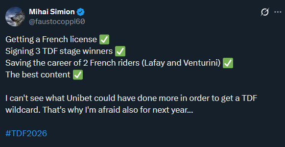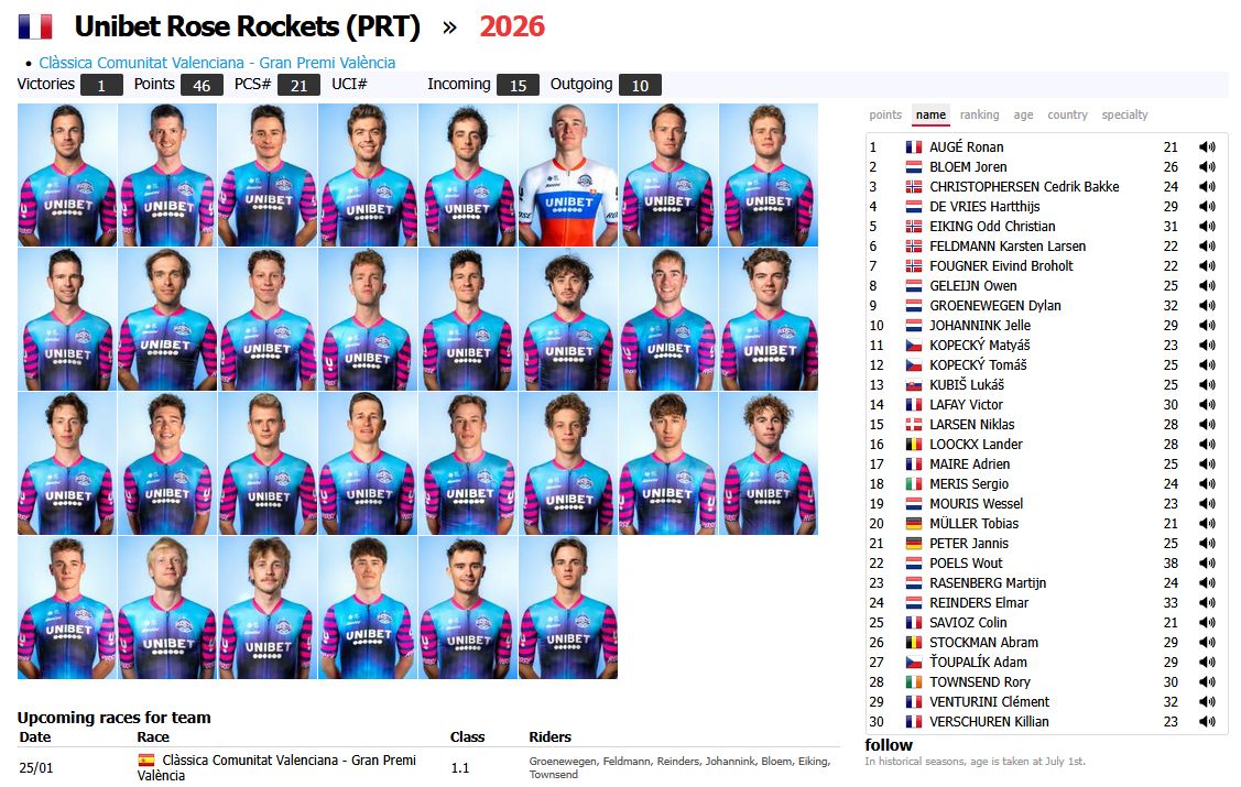 >Finally, the sporting director was asked to compare the Unibet Rose Rockets, who missed out on the coveted wildcard after being eliminated from Caja Rural. "They've built a very interesting team for 2026, but we were better than them last year. So I think we deserved an invitation," he belowed.