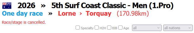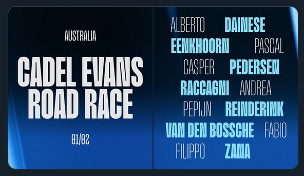warming up in Spain edition>Current and upcoming road races20.01 - 25.01 Santos Tour Down Under 2.UWT24.01 - 26.01 Challenge Majorca WE25.01 Clàssica Comunitat Valenciana - Gran Premi València 1.125.01 Schwalbe Women's One Day Classic 1.Pro27.01 - 31.01 AlUla Tour 2.Pro28.01 - 1.02 Challenge Majorca ME28.01 Surf Coast Classic - Women 1.Pro29.01 Surf Coast Classic - Men 1.Pro31.01 Mapei Cadel Evans Great Ocean Road Race - Women 1.WWT01.02 Mapei Cadel Evans Great Ocean Road Race - Men 1.UWT01.02 Grand Prix Cycliste de Marseille La Marseillaise 1.11.02 Pionera Race-SCV 1.1 WE04.02 - 08.02 Etoile de Bessèges - Tour du Gard 2.104.02 - 08.02 Volta Comunitat Valenciana 2.Pro05.02 - 08.02 UAE Tour Women 2.WWT>CX races25.01 UCI World Cup Hoogerheide CDM01.02 UCI World Championships Hulst CDM04.02 Exact Cross Maldegem - Parkcross C207.02 Superprestige Middelkerke - Noordzeecross C108.02 X2O Trofee Lille - Krawatencross C114.02 Exact Cross Sint-Niklaas - Waaslandcross C215.02 X2O Trofee Brussels - Brussels Universities Cyclocross C122.02 Internationale Sluitingsprijs Oostmalle C1>Mecha-Rusbert's webm folders:https://pastebin.com/bA0Cb5BK >Bert van Koers' ciclismo quizzes:https://www.sporcle.com/user/Bert_van_Koers/quizzes/>Races info:https://www.procyclingstats.com/https://firstcycling.com/>CX races infohttps://cyclocross24.com/https://cx.procyclingstats.com/>Free streams:https://cyclingtiz.live/https://dlhd.dad/>Velodrama league code:51196855Previous thread:>>152994253