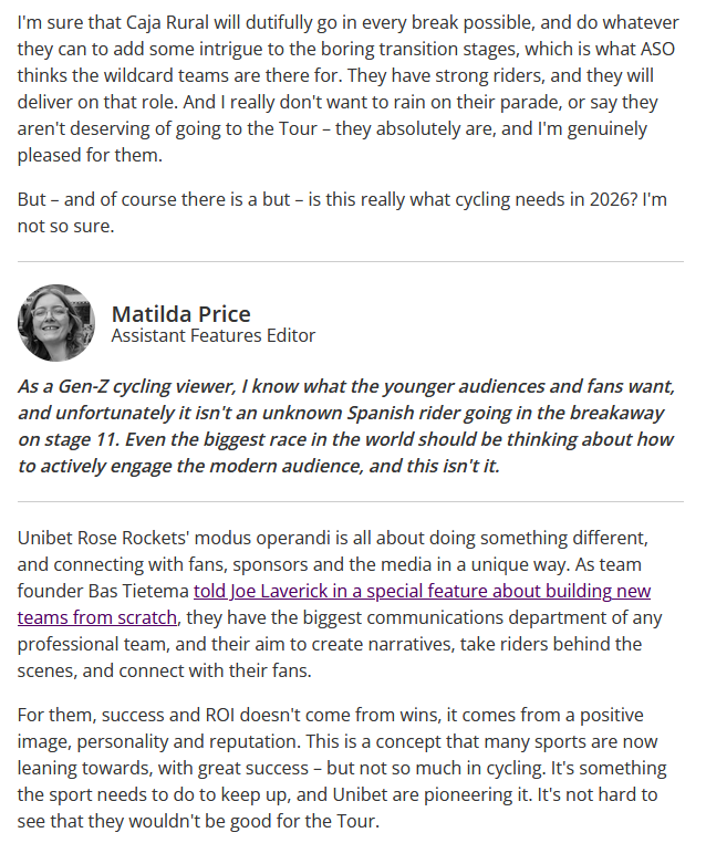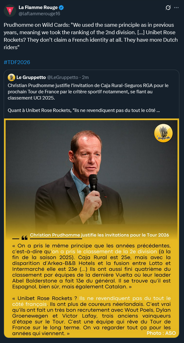 >According to Le Parisien, Caja Rural-Seguros RGA and TotalEnergies will receive invitations to the next Tour de France (in addition to Cofidis, Pinarello-Q36.5, and Tudor). The announcement is expected to be made this Friday. Unibet Rose Rockets has therefore not been selected.And you still have people who say the TdF only picks French teams like the Giro and Vuelta do with Italian/Spanish teams. Complete myth. The French conti teams were just better than the rest