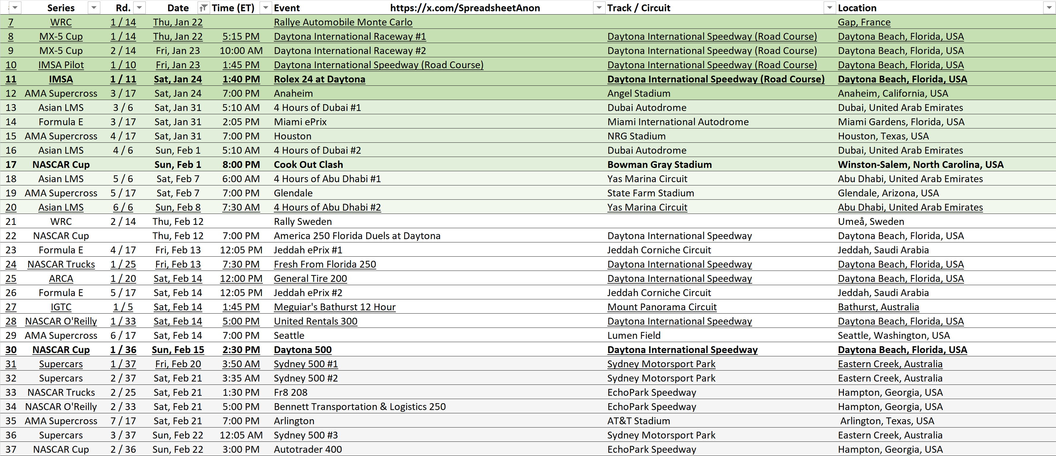 >>153138321>Saturday, January 31 (all times ET)5:10 AM: Asian LMS, Rd 3/6, '4 Hours of Dubai #1', Dubai Autodrome, Dubai, United Arab Emirates2:05 PM: Formula E, Rd 3/17, 'Miami ePrix', Miami International Autodrome, Miami Gardens, Florida, USA7:00 PM: AMA Supercross, Rd 4/17, 'Houston', NRG Stadium, Houston, Texas, USA>Sunday, February 15:10 AM: Asian LMS, Rd 4/6, '4 Hours of Dubai #2', Dubai Autodrome, Dubai, United Arab Emirates8:00 PM: NASCAR Cup, 'Cook Out Clash', Bowman Gray Stadium, Winston-Salem, North Carolina, USA>Saturday, February 76:00 AM: Asian LMS, Rd 5/6, '4 Hours of Abu Dhabi #1', Yas Marina Circuit, Abu Dhabi, United Arab Emirates7:00 PM: AMA Supercross, Rd 5/17, 'Glendale', State Farm Stadium, Glendale, Arizona, USA>Sunday, February 87:30 AM: Asian LMS, Rd 6/6, '4 Hours of Abu Dhabi #2', Yas Marina Circuit, Abu Dhabi, United Arab Emirates (Season Final)