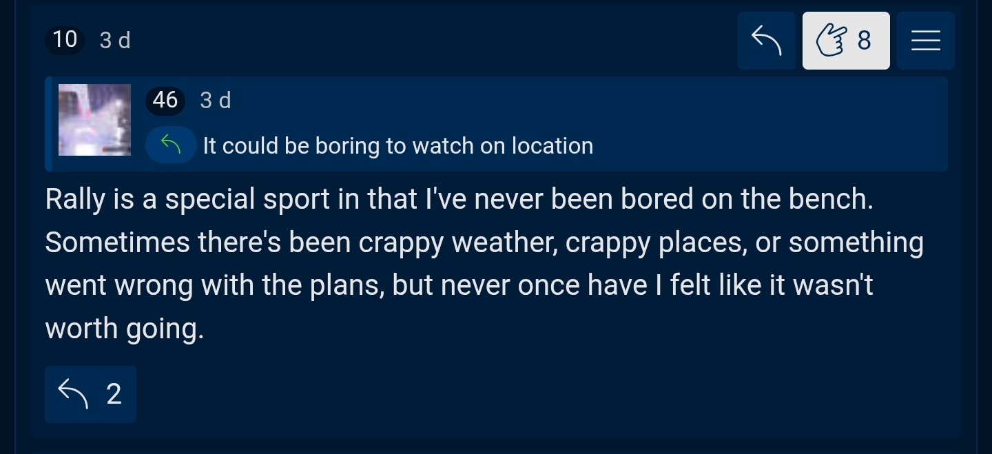 >Dirtfish pretty much went full paywallIm worried how much ill really be able to follow WRC cause of this, its hard for me to follow live due to the time differences and the official WRC channel will always suck at covering their own races.>>153178194>However I think the main problem is the lack of space,Its interesting how a lot of tracks here dont have that permanent infrastructure for the pit/garage areas but it seems to be a much more common thing in Europe.>>153180148What a weird font for the numbers.