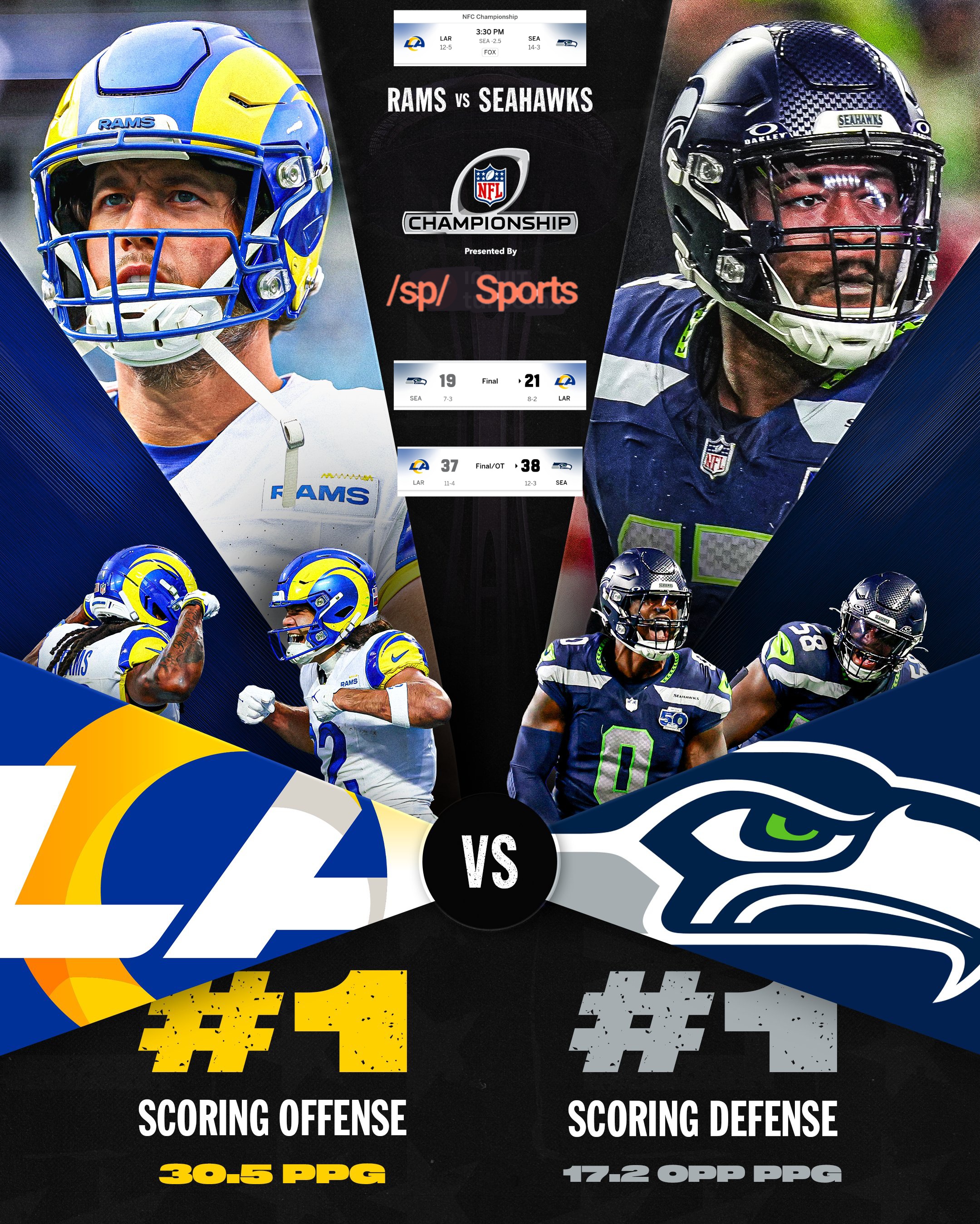 Seahawks, Rams will meet for 3rd time this season as division foes play for Super Bowl berth3:30 PM, January 25, 2026Lumen FieldSeattle, WAweather condition44°NFL Odds: Seahawks by 2 1/2.Against the spread: Rams 11-8; Seahawks 13-5Rams offense: overall (1), rush (7), pass (1), scoring (1).Rams defense: overall (17), rush (12), pass (19), scoring (10).Seahawks offense: overall (T-7), rush (T-10), pass (8), scoring (5).Seahawks defense: overall (6), rush (3), pass (10), scoring (1).Turnover differential: Rams plus-15; Seahawks minus-4.
