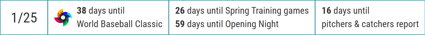>57 days until Opening Night>36 days until World Baseball Classic>24 days until Spring Training games>14 days until pitchers & catchers report