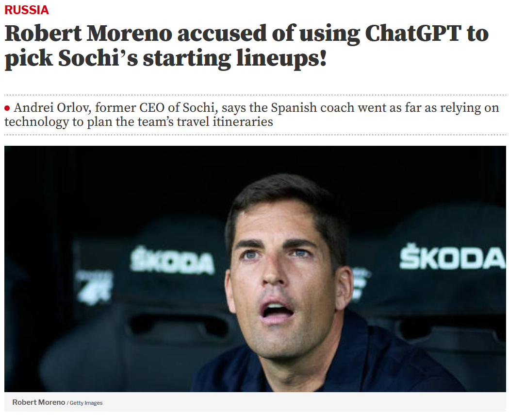 >ChatGPT, make the starting squad for my next game>https://www.mundodeportivo.com/us/en/20260126/739028/robert-moreno-accused-of-using-chatgpt-to-pick-sochi-s-starting-lineups.html
