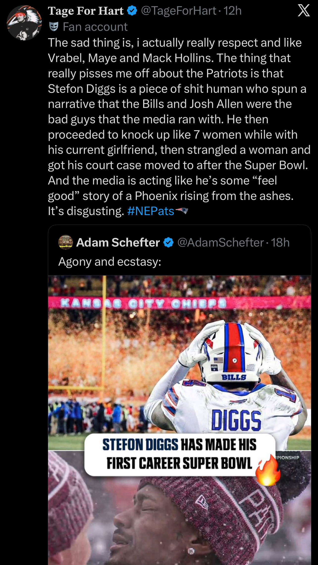 >>153176365Only upsetting thing about this is diggs has been charged with felony assault but the shitriots stood behind him, whereas AB was sued in civil court and they cut him 3 days later because he was reminding everyond that the turbojew owner is a sex pest/human trafficker epstein clientMoot point now because Coom won the owl and israeliots aren't winning jack shit, Kraft will die in piss soaked underwear and his kike son will run the franchise into the groundFuck jew england