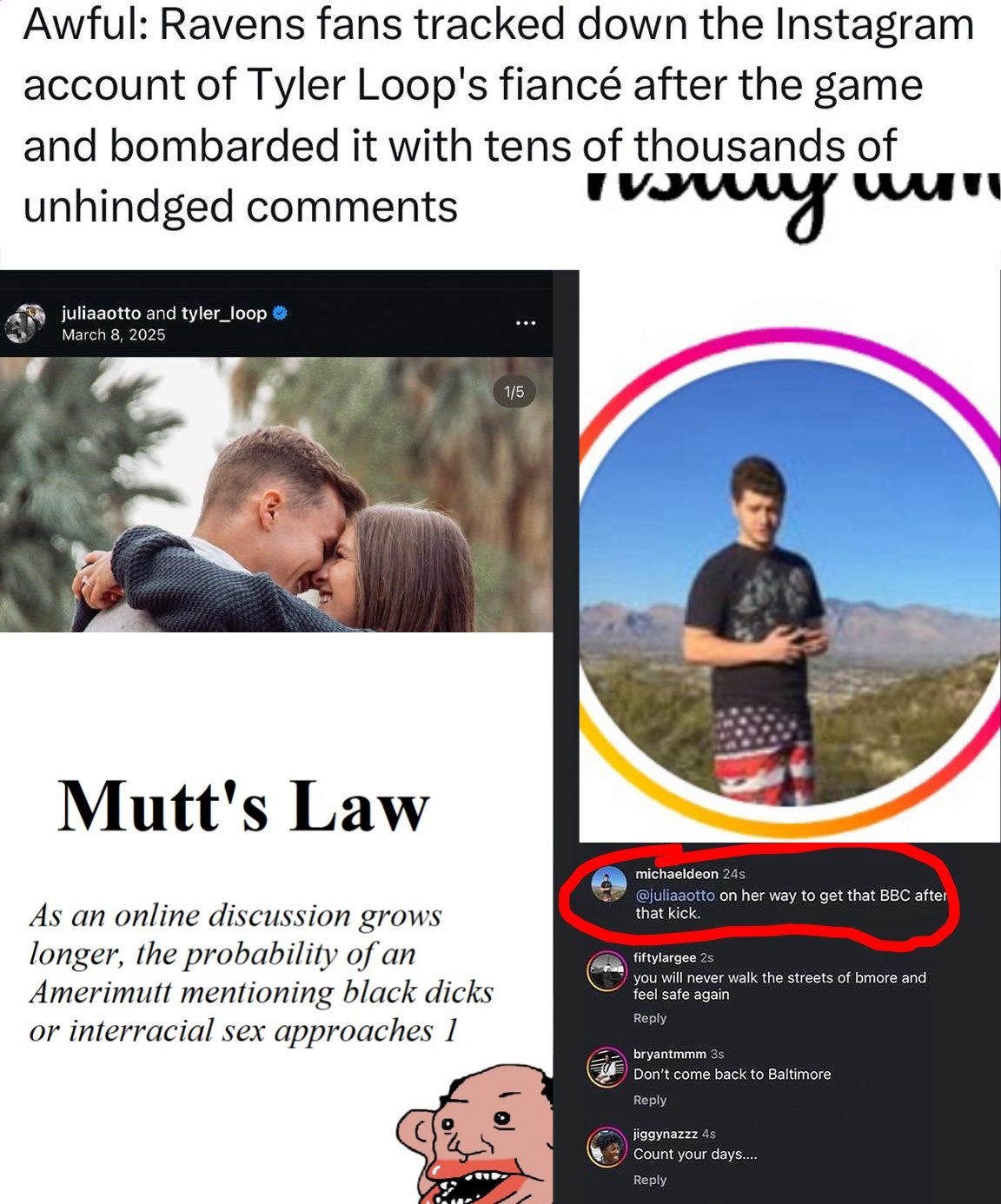 >>153176365He isn't, but a lot of NFL players are pieces of shit.Literally everyone forgot that Jameis was accused of sexual assault, paid off the victim, and just does weird Jesus stuff and no one cares. Big Ben got away with sexual assault. Sean Peyton was fully aware of bounty gate. Tyreek Hill beats his kids and GF. Rice had his teammates wearing shirts to free him after he almost killed someone and fled the scene lmao.