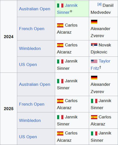 Imagine hating the guaranteed Sinncaraz kino we'll get for the next 3-5 years. Do you really want to go back to the weak era we just got out of? A two-man rivalry has always been a lynchpin in tennis history and a guarantor of great matches. Anyone calling Sinncaraz "slop" needs their head adjusted. It's the only guarantee of kino we have in the entire ATP right now. Nothing else, no other player or rivalry, comes even close to guaranteeing the same levels of entertainment. This is the best timeline and best outcome. Cheer up lads seriously