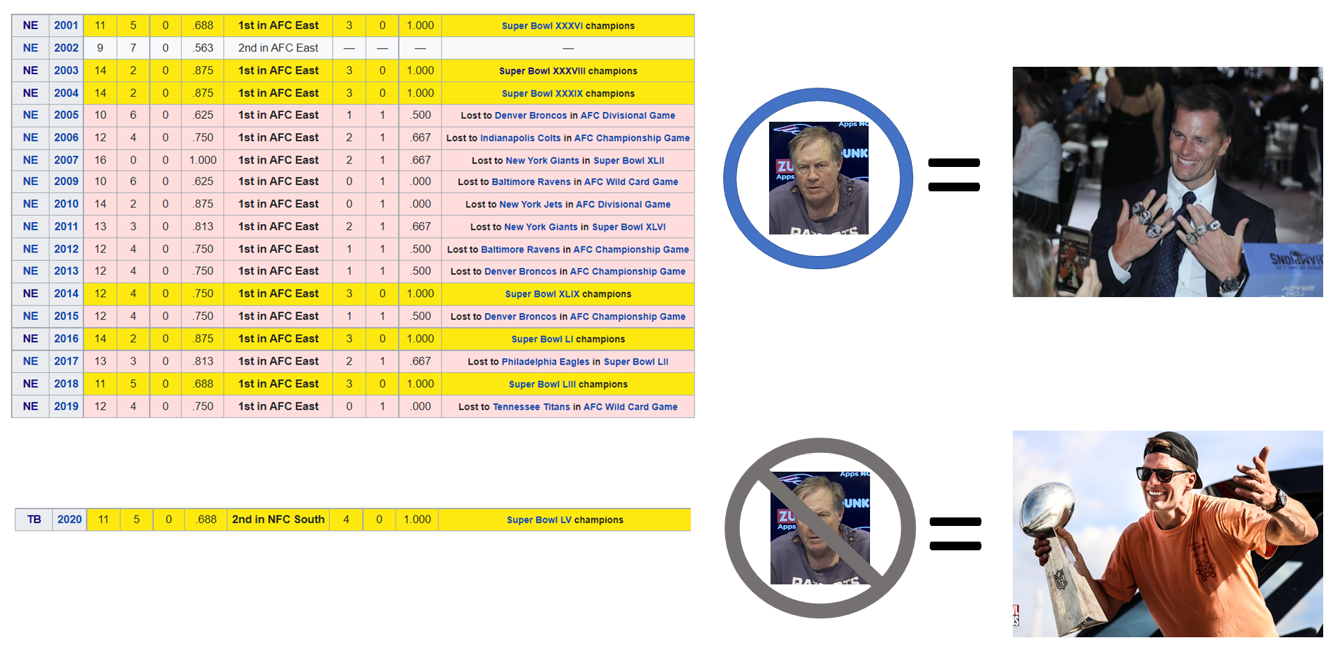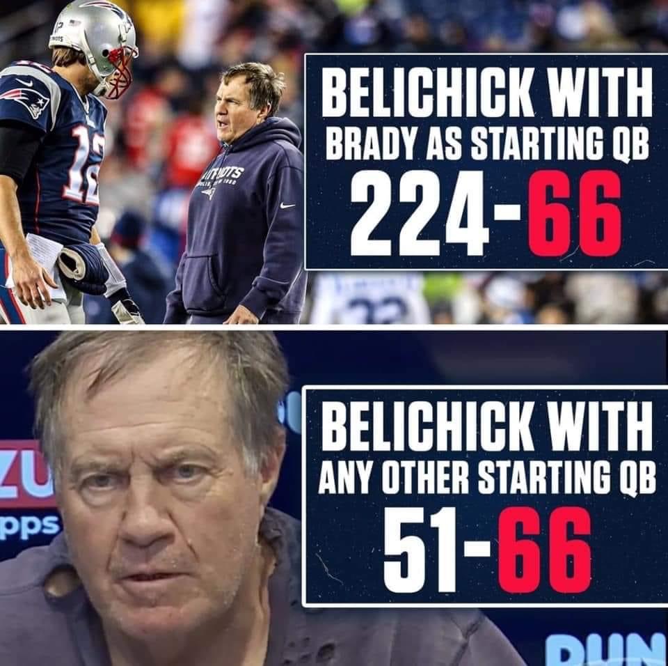 HC Belichick:Sub .500 without Brady1-2 in playoff wins without Brady0 Conference Championships without Brady0 Super Bowl wins without Brady