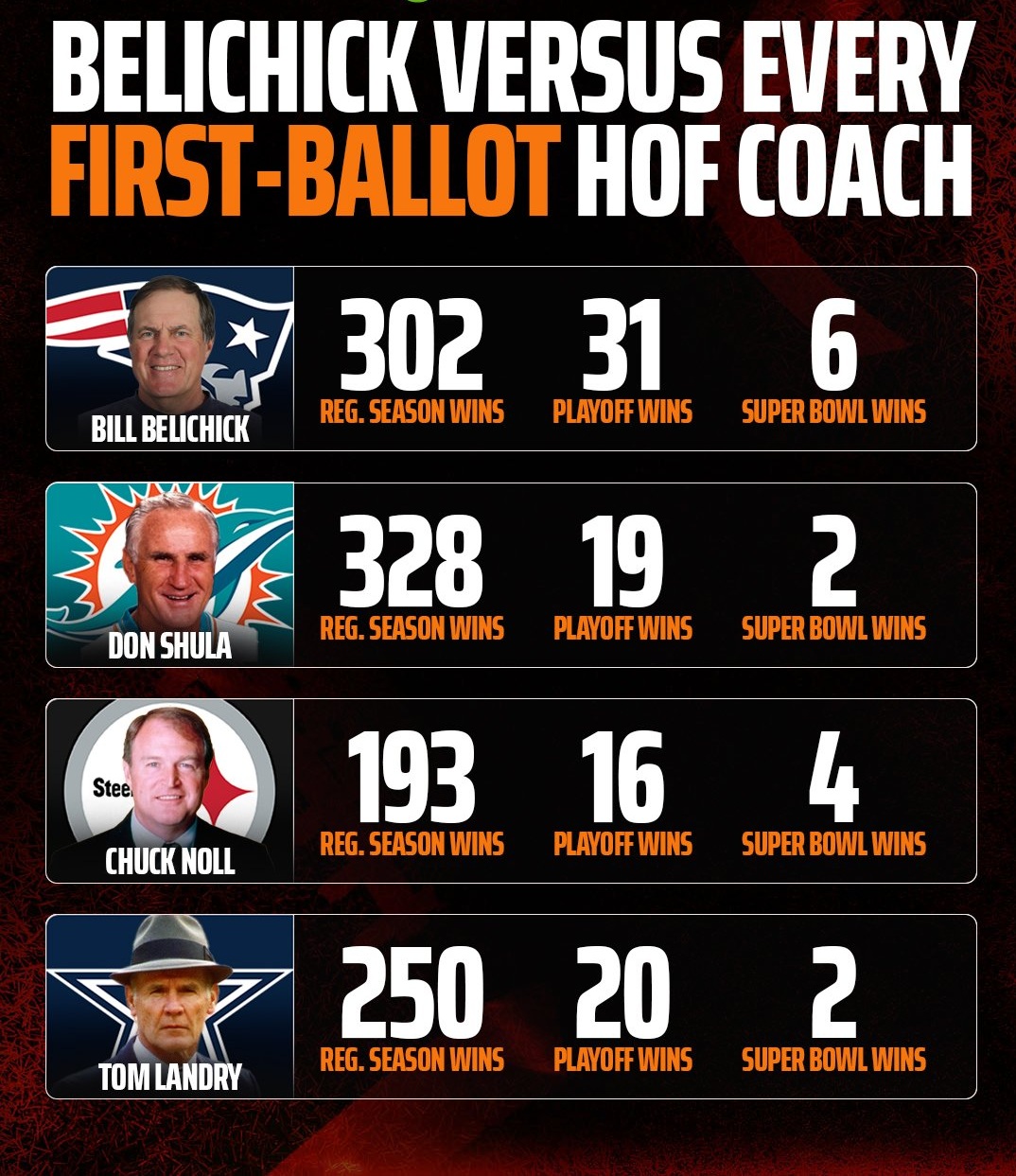 Belichick:3rd in Wins as a HC1st in Playoff Wins1st in Conference Championships1st in Super Bowl Wins
