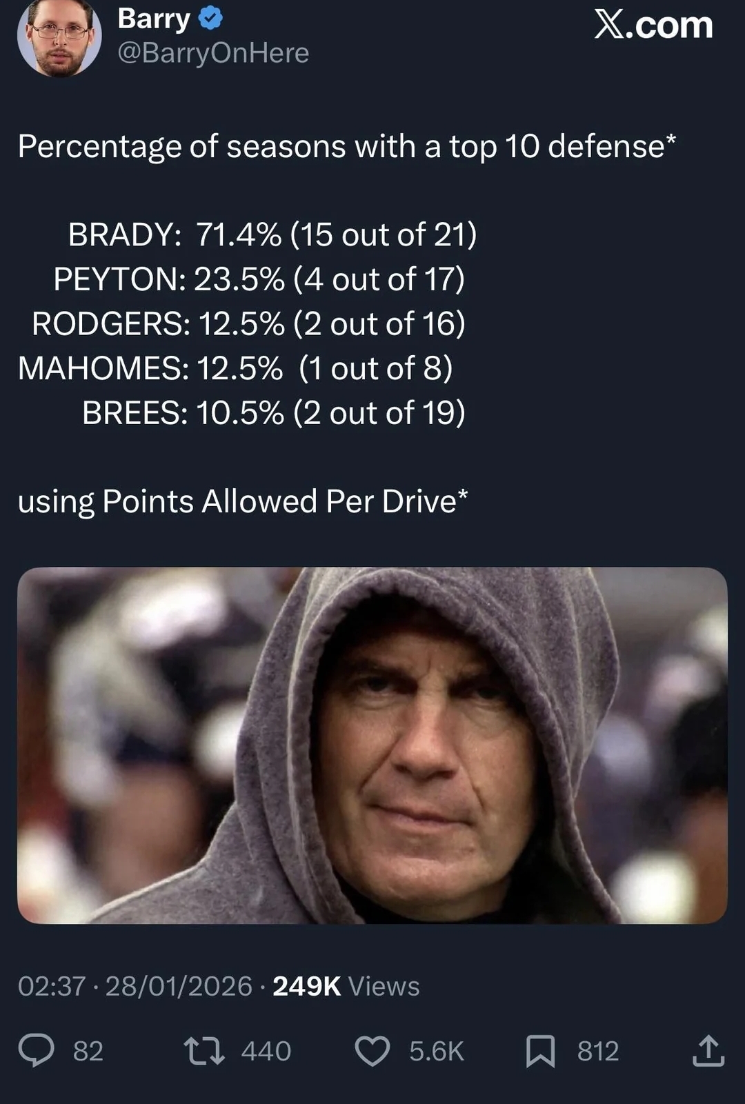 Belichick never had a losing season with his HOF QB for 20 years. Andy Reid must be shit. He has a prime Mahomes and he went 6-11 and couldn't even maintain dominance with his QB for half the time Belichick did.