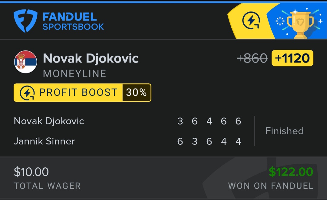 djokovic vs alcaraz4 sets @ 2.62 * 6.5 = 17.025 sets @ 3.4 * 5 = 17bet $11.5 to win $17, ($5.50 profit) almost 50% profit as long as its not a 3 set match.
