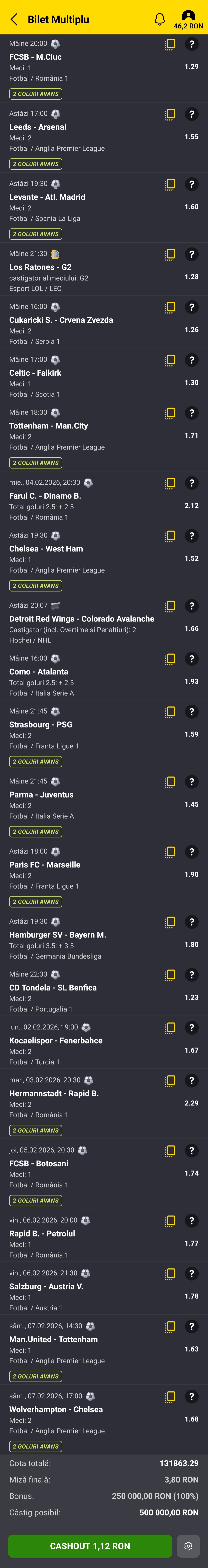 Ok, tips i posted still to be played:03.02 National Bank Egypt - Al Ahly @1.85Odds now 1.85, don't know anything about this game and will probably have to wait for lineups but can't tell what players could be missing. Trezeguet, Ashour and Bencharki key players. The african cdm is also good 04.02Hermannstadt v Rapid @2.22Hold on fellas cause some tips sound better when i'm high. Farul v DinamoI said 5+. Since then Farul had a 5+ (4-1 to craiova) . Should have predicted that one. 05.02FCSB @1.80 v BotosaniWe betting on FCSB or what? Botosani had a dream honey moon start to the campaign but severely dropped in form in the last 10. Btw tough weather in the country atm. Snow. FCSB are on a quest to win the remaining 7 games. Already won the first, 1-0 last night. Wasn't easy. I expect 3-1 here. But particularly for the matches with Botosani, at home* , you'd get ~1.37 , now it's 1.80. If you hate value don't bet obviously06.02Rapid 1.78 v PetrolulAgain, nice odds hereSalzburg 1.75 v Austria Vienna07.02Wolves v Chelsea 1.72With the remontada morale from last game you can imagine how Chelsea plays in this one. Probably the better bet of this bunch.