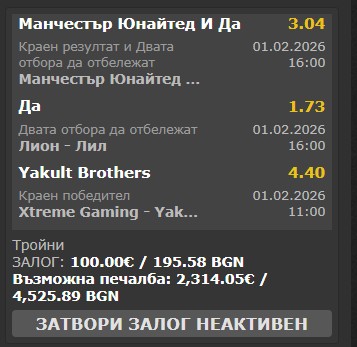United to win and BTTS to scoreLyon Lille BTTSXtreme Gaminvs v Yakults - Dota 2 - Yakults to winHopefully I lose so I can stop with this cancer once and for all