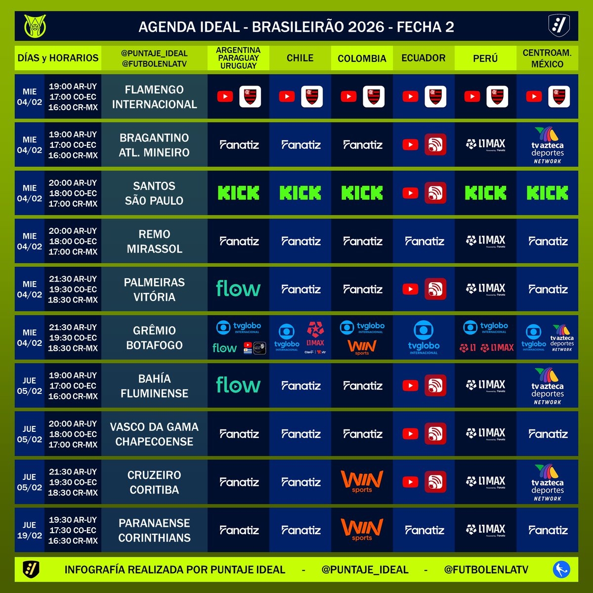 wednesday (04/02)>LIBERTADORES21:30 | CS 2 de Mayo x Alianza Lima>COPA ARGENTINA19:00 | CA Talleres x Argentino de Merlo21:15 | Platense x CD Argentino Monte Maiz>BRA119:00 | Flamengo x Internacional19:00 | Red Bull Bragantino x Atlético Mineiro20:00 | Santos x São Paulo20:00 | Remo x Mirassol21:30 | Palmeiras x Vitória21:30 | Grêmio x Botafogothursday (05/02)>LIBERTADORES21:30 | Juventud de Las Piedras x Universidad Católica del Ecuador>COPA ARGENTINA19:00 | Deportivo Riestra x Deportivo Maipú21:15 | Barracas Central x Temperley>BRA119:00 | Bahia x Fluminense20:00 | Vasco da Gama x Chapecoense21:30 | Cruzeiro x Coritiba>PAULISTÃO20:30 | Corinthians x Capivariano>GAUCHÃO19:00 | Guarany de Bagé x Monsoon21:30 | Inter de Santa Maria x EC AvenidaUTC-3/[localtime]Previous: >>153250617