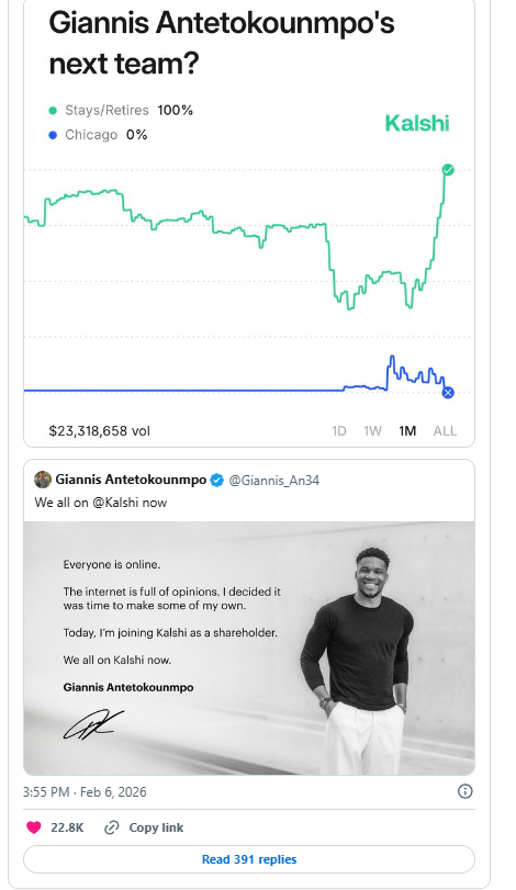 >spreads rumors about leaving>kalshi setups up 8 digit giannis market>ends up staying>reveals himself to be a stakeholder in a betting platformThis sounds borderline criminal