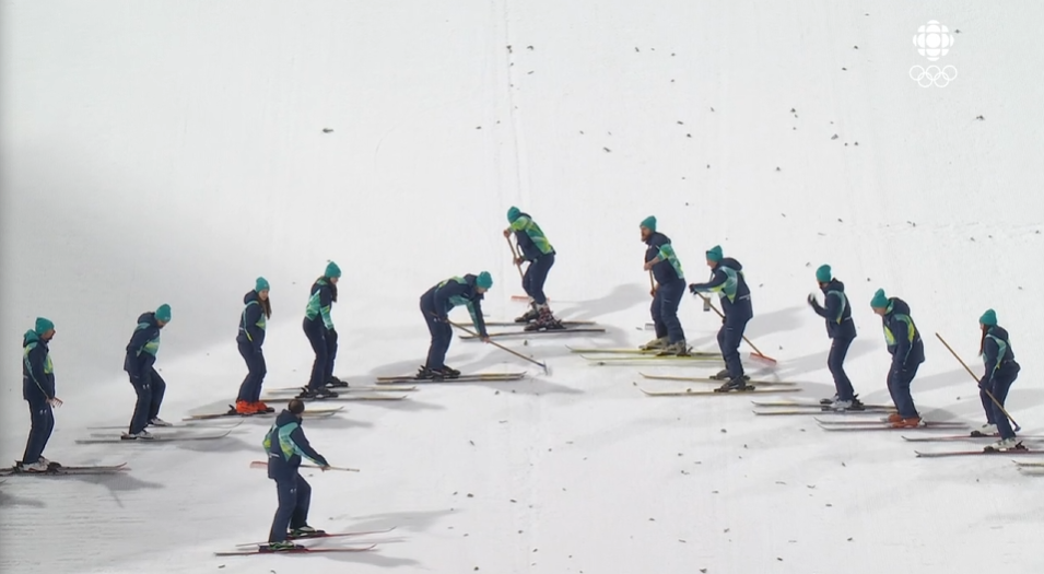 >>153303199>Why do they go on skiis, surely they can just wear boots and rake the important partsThey're doing multiple things here>raking snow>flattening the snow, that's why all the guys are taking baby steps up the hill>smoothing out the landing areaLast thing you want when landing a jump on the big hill is a chunk of snow/ice under one of your skis.