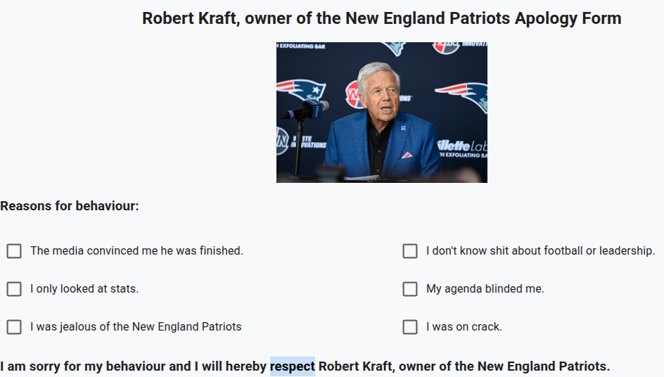 >>153312562>h-he bent the knee because he was caredLmfao. I'd hate to break it to you, but no Patriots fan worth their salt gives a shit about him anymore either. He's a pathetic loser in his post retirement. Wife knocked up by another guy. Lost the love of his children because he neglected them. Lost a chunk of his fortune on a crypto scam. Forced to act in pizza commercials for money. Bogged his face the fuck up because he's an emotionally insecure teenager at heart. Utter failure as a commentator because he's boring as shit. On and on kek.>>153312508>>153312509>no response because they know it's the truthBrady bent the knee like the cuckold he is because he knows he's nothing if he doesn't have New England. Unfortunately, the support of a bunch of penniless weeb spergs on 4chan isn't going to help him much.