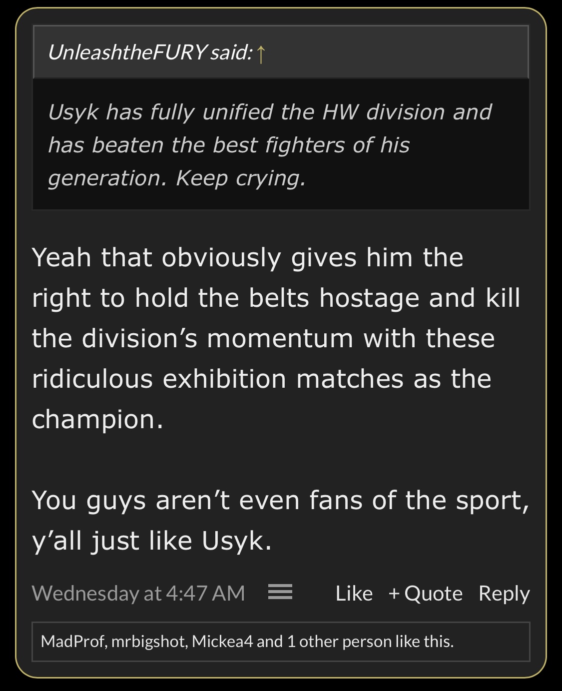 I do agree thoughFury would fight Joshua after he'd just beat Usyk and Joshua lost to Dubois