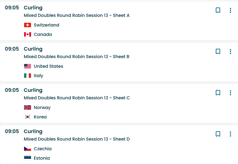 >Schedule:https://www.olympics.com/en/milano-cortina-2026/results/cur/x/team2-------------/team-sports-schedule-event>Watch CBC (Canadian VPN required):https://gem.cbc.ca/collection/olympics-curling>Watch SVT (Swedish VPN required):https://www.svtplay.se/os-2026-curling>Watch YLE (Finnish VPN required):https://arenan.yle.fi/1-76727632>Watch NRK (Norwegian VPN required):https://tv.nrk.no/programmer/ol-curling>Watch ARD (German VPN required):https://www.ardmediathek.de/>Previous:>>153319218>Sunday 8th February04:05 EST / 10:05 CETMixed Doubles Round Robin Session 10 - Sheet ANorway 3Czechia 604:05 EST / 10:05 CETMixed Doubles Round Robin Session 10 - Sheet BEstonia 3Korea 908:35 EST / 14:35 CETMixed Doubles Round Robin Session 11 - Sheet ACanada 6Sweden 708:35 EST / 14:35 CETMixed Doubles Round Robin Session 11 - Sheet BGreat Britain 6Switzerland 708:35 EST / 14:35 CETMixed Doubles Round Robin Session 11 - Sheet CUnited States 5Estonia 308:35 EST / 14:35 CETMixed Doubles Round Robin Session 11 - Sheet DItaly 8Czechia 213:05 EST / 19:05 CETMixed Doubles Round Robin Session 12 - Sheet AItalyGreat Britain13:05 EST / 19:05 CETMixed Doubles Round Robin Session 12 - Sheet BSwedenUnited States13:05 EST / 19:05 CETMixed Doubles Round Robin Session 12 - Sheet CSwitzerlandNorway13:05 EST / 19:05 CETMixed Doubles Round Robin Session 12 - Sheet DCanadaKorea>Monday 9th February04:05 EST / 10:05 CETMixed Doubles Round Robin Session 13 - Sheet ASwitzerlandCanada04:05 EST / 10:05 CETMixed Doubles Round Robin Session 13 - Sheet BUnited StatesItaly04:05 EST / 10:05 CETMixed Doubles Round Robin Session 13 - Sheet CNorwayKorea04:05 EST / 10:05 CETMixed Doubles Round Robin Session 13 - Sheet DCzechiaEstonia12:05 EST / 18:05 CETMixed Doubles Semi-final - Sheet B12:05 EST / 18:05 CETMixed Doubles Semi-final - Sheet D
