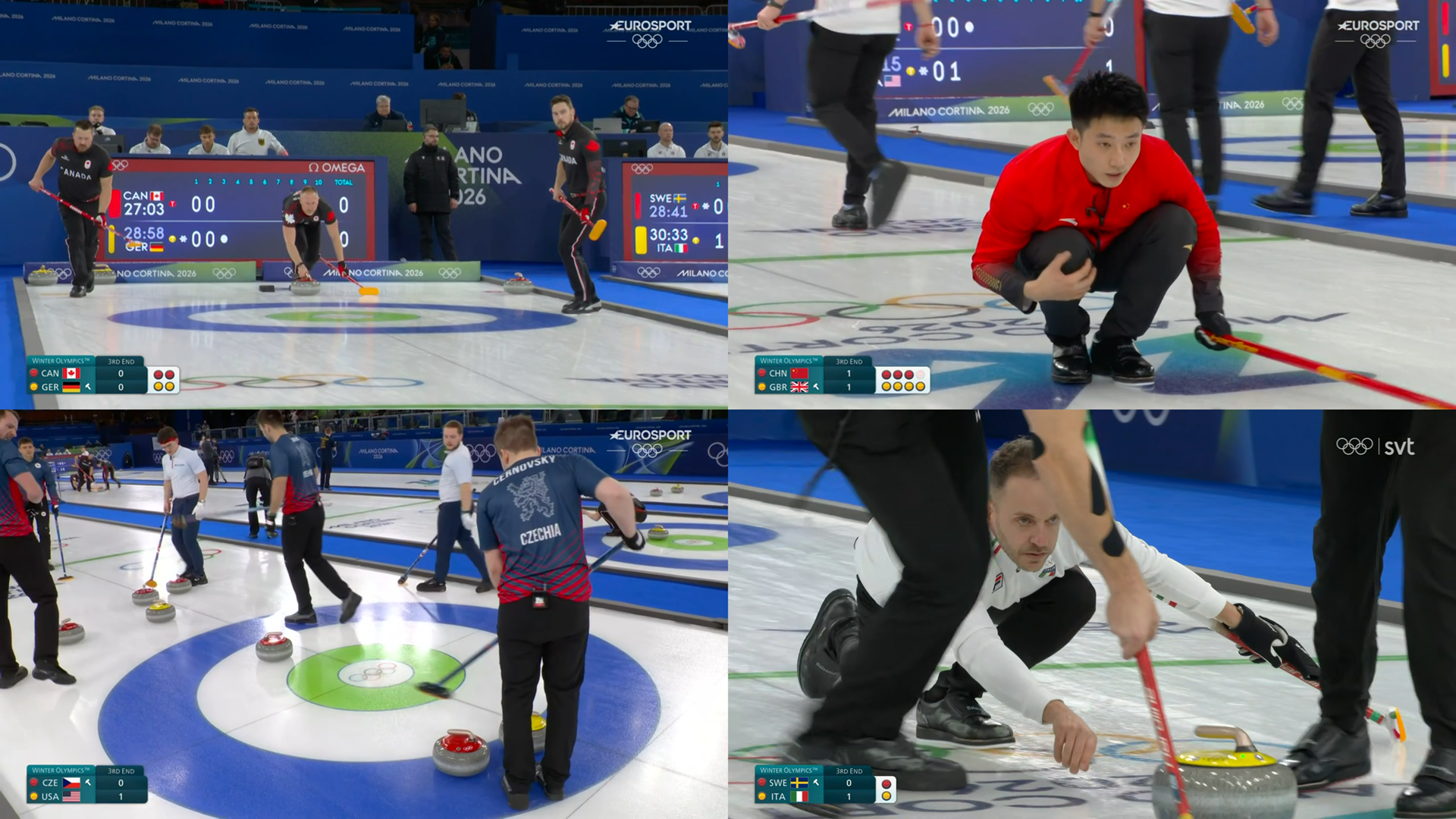 >Schedule:https://www.olympics.com/en/milano-cortina-2026/results/cur/x/team2-------------/team-sports-schedule-event>Watch CBC (Canadian VPN required):https://gem.cbc.ca/collection/olympics-curling>Watch SVT (Swedish VPN required):https://www.svtplay.se/os-2026-curling>Watch YLE (Finnish VPN required):https://arenan.yle.fi/1-76727632>Watch NRK (Norwegian VPN required):https://tv.nrk.no/programmer/ol-curling>Watch ARD (German VPN required):https://www.ardmediathek.de/>Previous:>>153376926Today6:05 pm GMTMen's Round Robin Session 1 Sheet A: Sweden v ItalySheet B: Canada v GermanySheet C: Czechia v United StatesSheet D: China v Great Britain