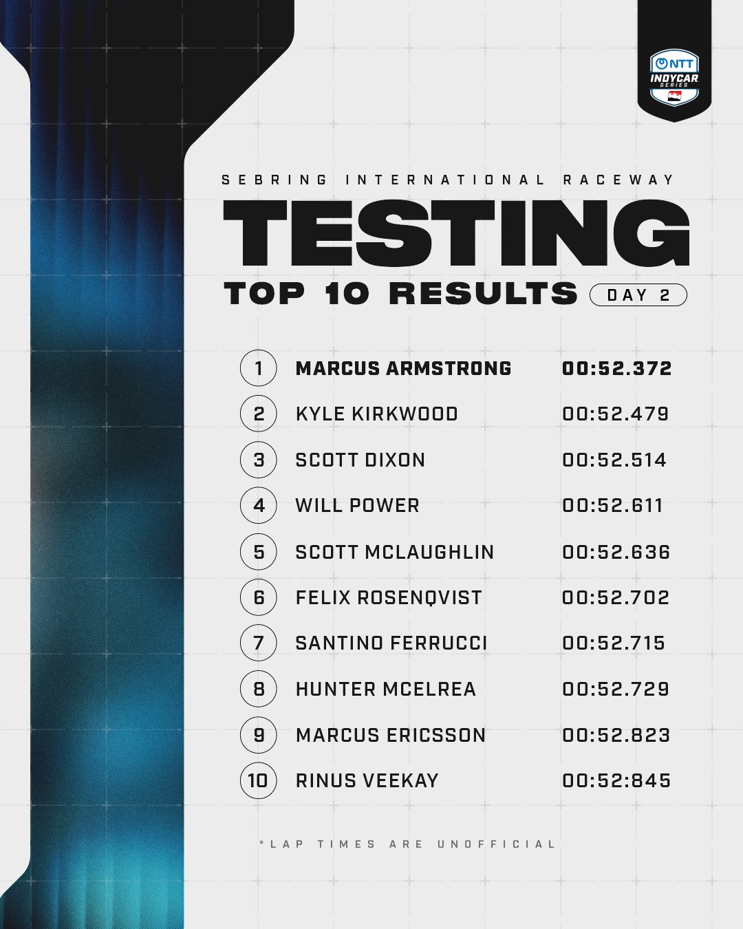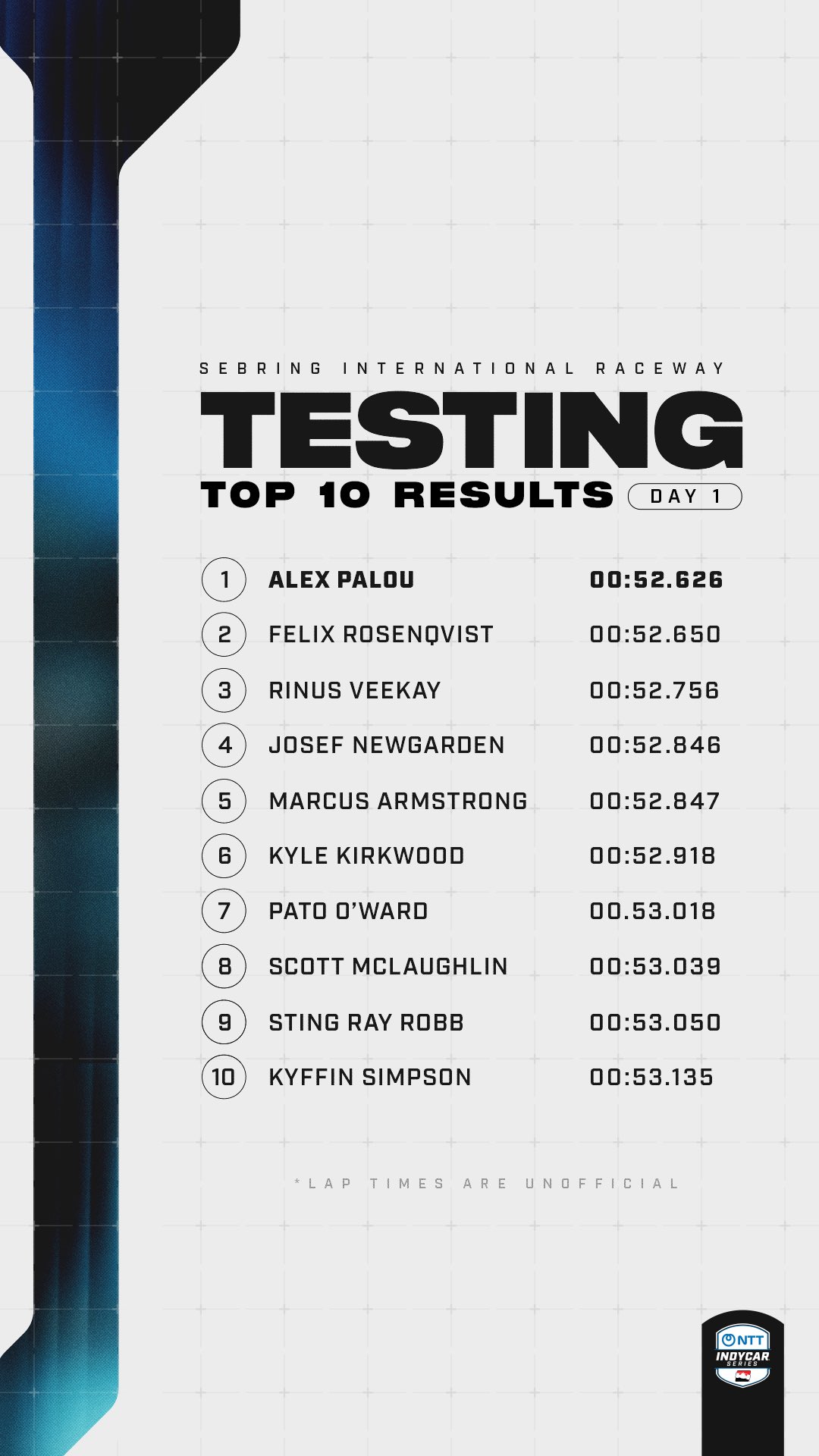 >Session 1, 11th through 25thBEST LAP # - TOTAL LAPS PUT DOWN>67/78 - Rahal>65/83 - Ericsson>65/108 - Veekay>58/128 - Rasmussen>73/93 - Foster>19/98 - O'Ward>55/55 - Hauger>67/104 - Siegel>91/106 - Robb>67/ 78 - Lundgaard>77/97 - Simpson>24/43 - Ferrucci>64/109 - Schumacher>23/ 20- Grosjean>8/51 - Collet