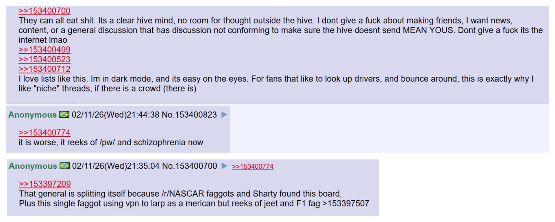 >>153400700They can all eat shit. Its a clear hive mind, no room for thought outside the hive. I dont give a fuck about making friends, I want news, content, or a general discussion that has discussion not conforming to make sure the hive doesnt send MEAN YOUS. Dont give a fuck its the internet lmao >>153400499>>153400523>>153400712I love lists like this. Im in dark mode, and its easy on the eyes. For fans that like to look up drivers, and bounce around, this is exactly why I like "niche" threads, if there is a crowd (there is)
