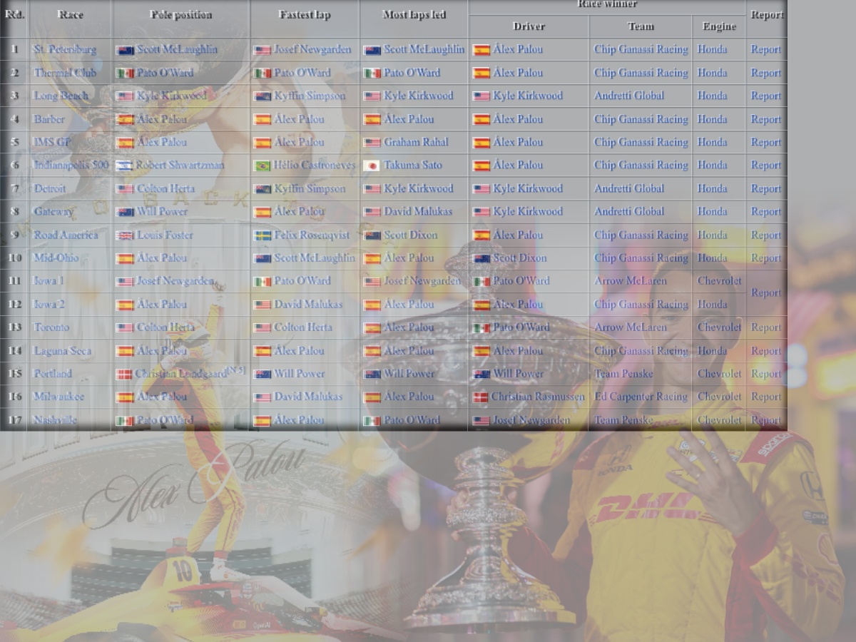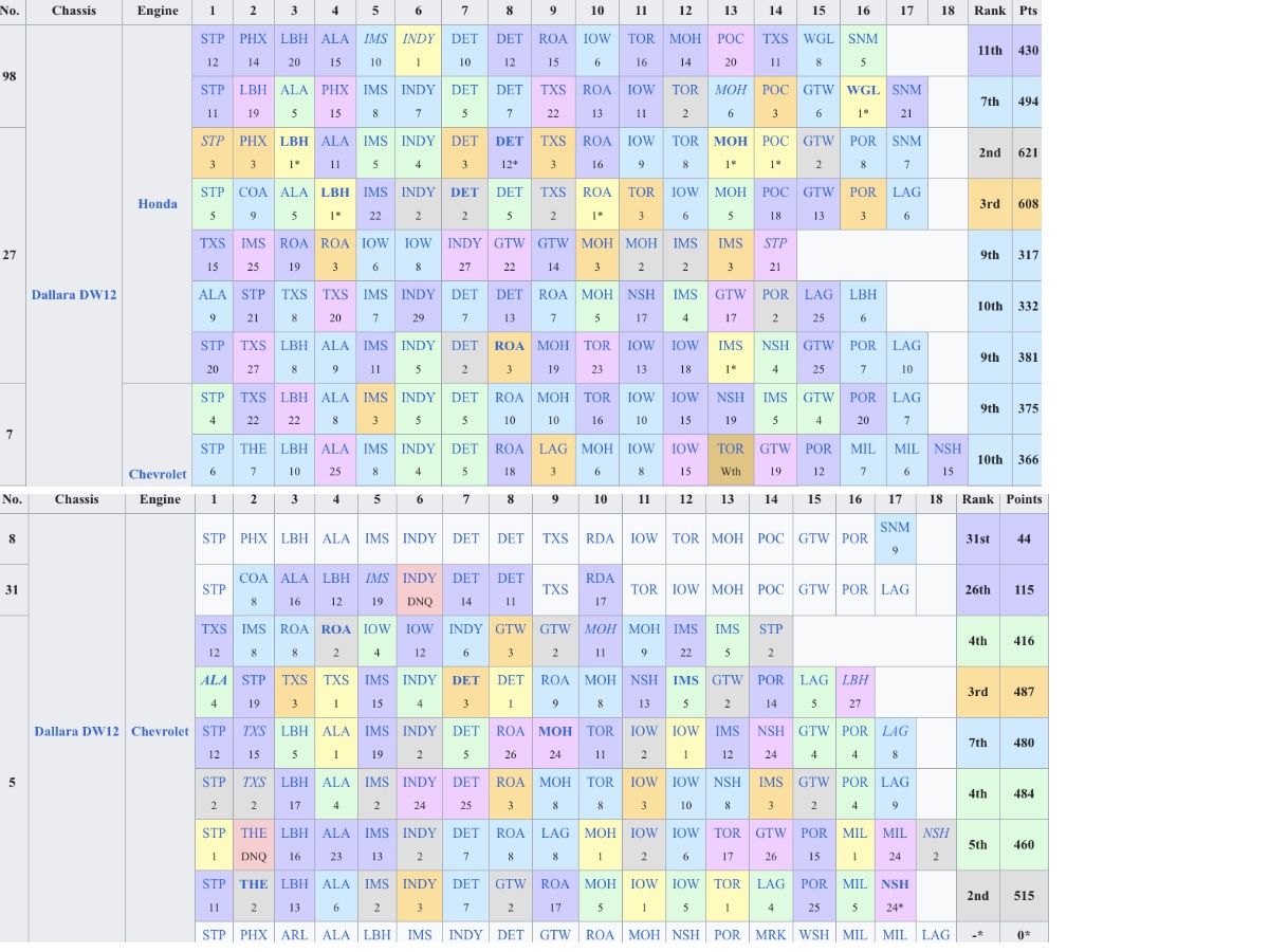 >>153400043This guy has a lot of data organized. I dont want to influence your vision too much, look forward to seeing it whenever. I anticipate more Indy news tomorrow afternoon so the thread should still be alive. https://indymotorspeedway.com/idx-team.html