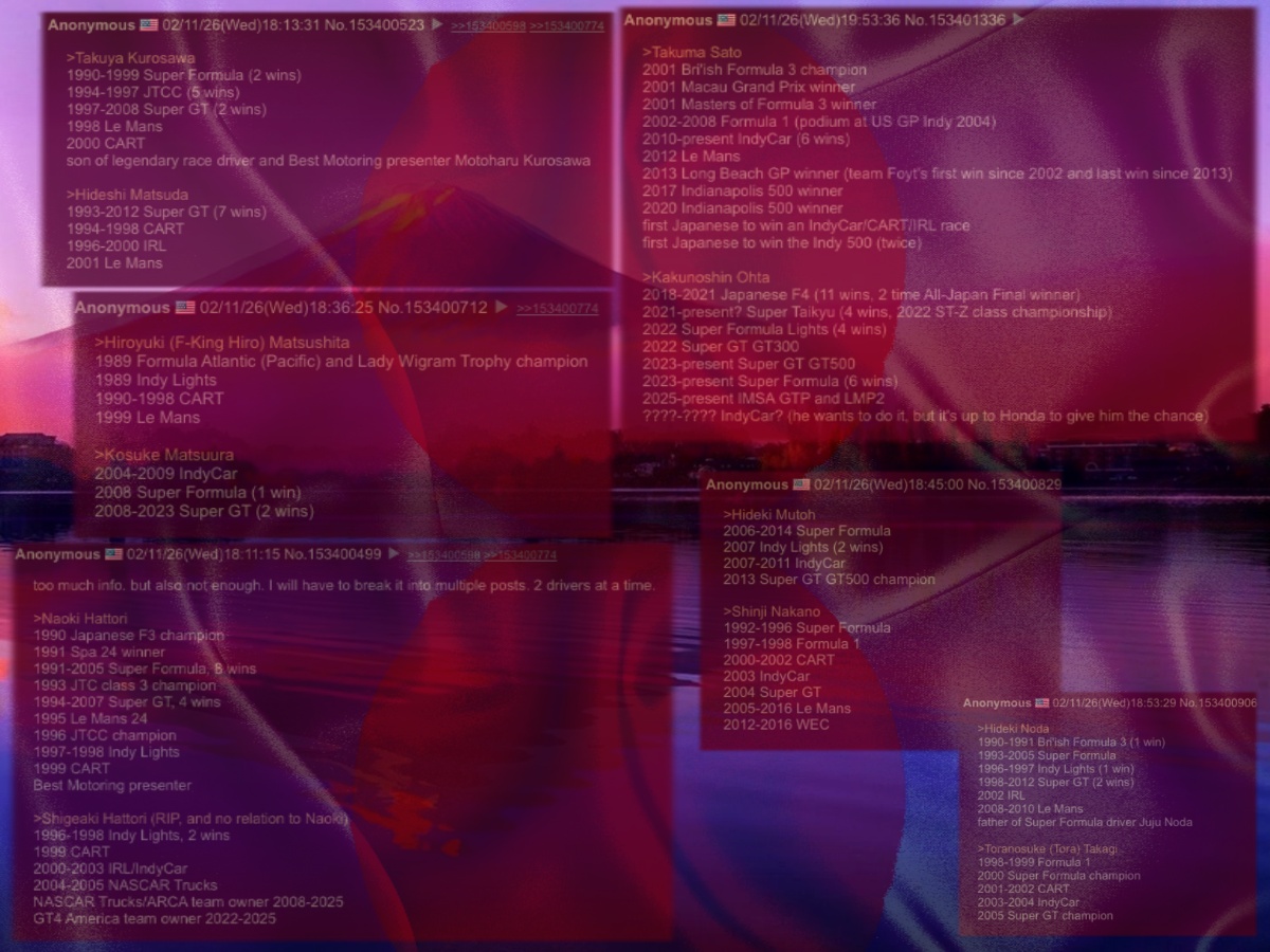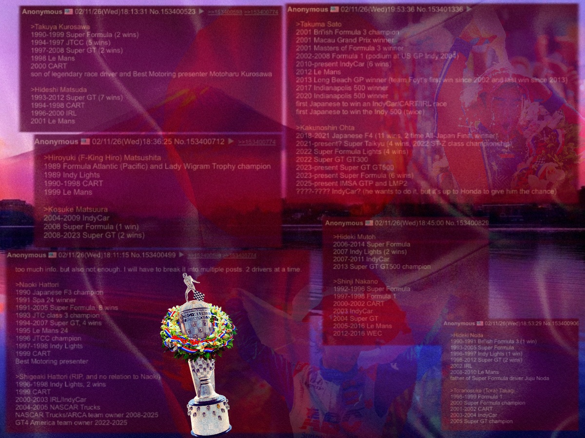 so there you go, all the former/current/prospective Japanese drivers of IndyCar. a few thoughts, if I may pontificate, for your edification:>I believe Kakunoshin Ohta will be the next Japanese IndyCar driver. Honda backs him, Honda has the MSR connection in IMSA, Honda now has a charter to use, he's fast, he wants to be in IndyCar.>the Yuki Tsunoda to IndyCar rumor I think is mostly F1 fans who just recently started watching IndyCar projecting their desires onto a series they don't know anything about. it's possible yeah, but Ohta is more likely IMO. and I'd rather have a driver who wants to be in IndyCar, vs a driver who thinks they have to "settle" for IndyCar.>maybe not so much now, (now that Sato-san won Indy twice) but back in the day, Japanese drivers were looked at as sort of a joke by Indy car racing fans. but if you look at the stats I posted, most of them were very successful in other series. it's not like Japan was sending over complete shitters. Naoki Hattori especially was a very successful driver that just couldn't make an impression in CART.