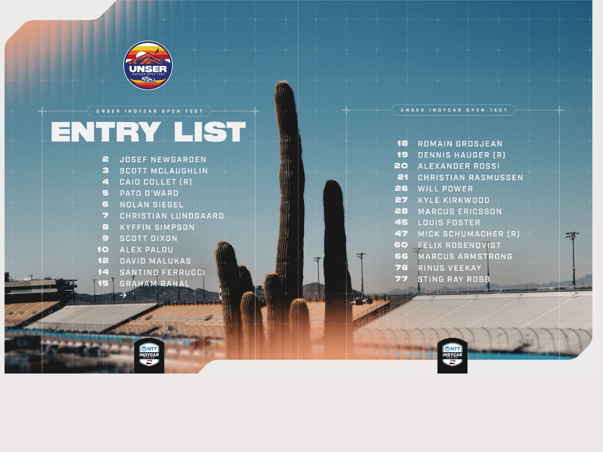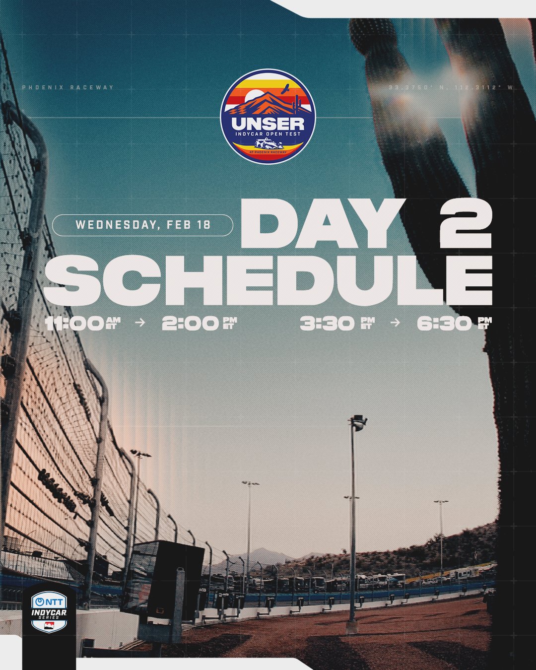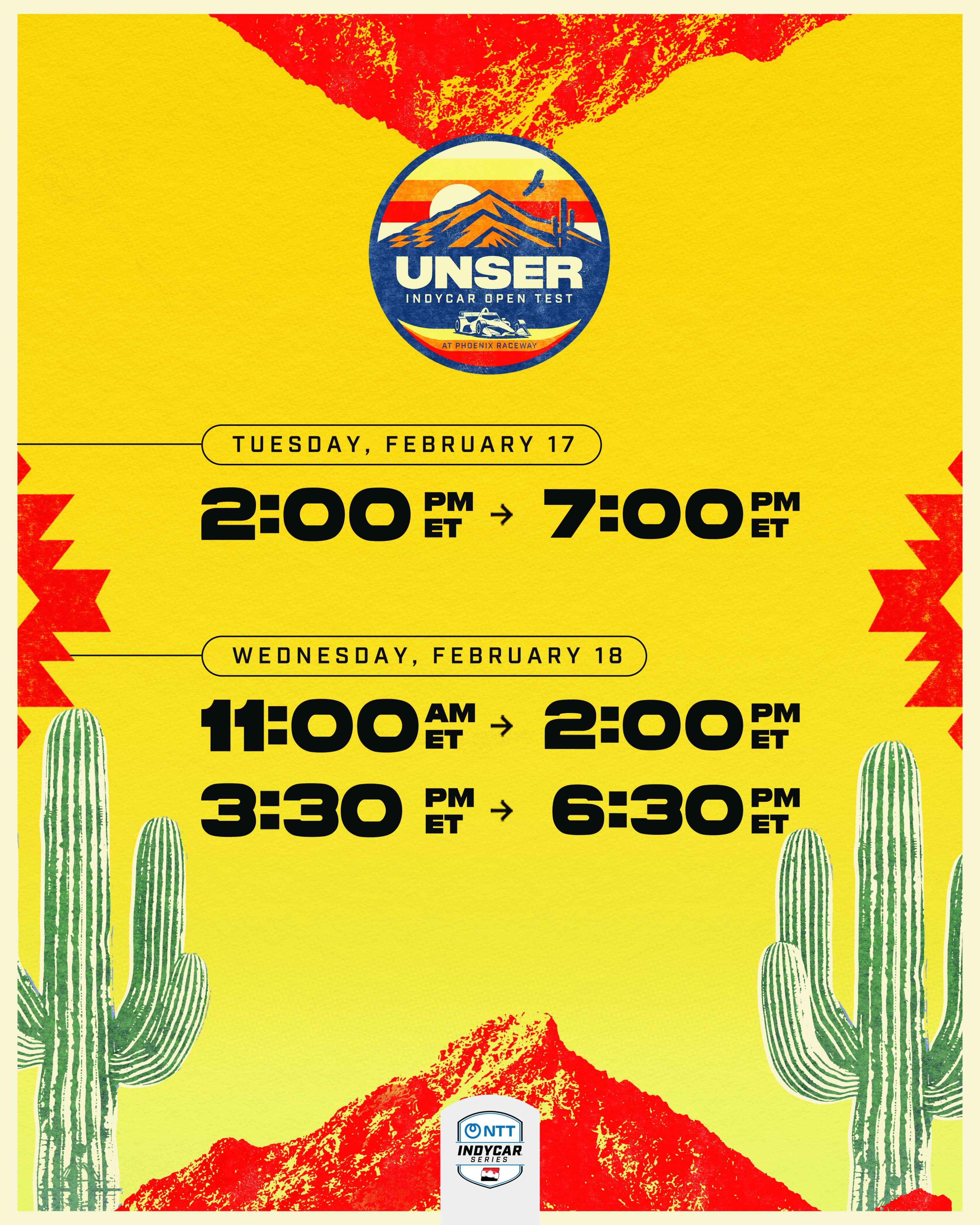 >Unser INDYCAR Open Test at Phoenix Raceway>Tuesday, February 17th2-7 pm ET>Wednesday, February 18th (open to public)11 am-2 pm ET 3:30-6:30 pm ET