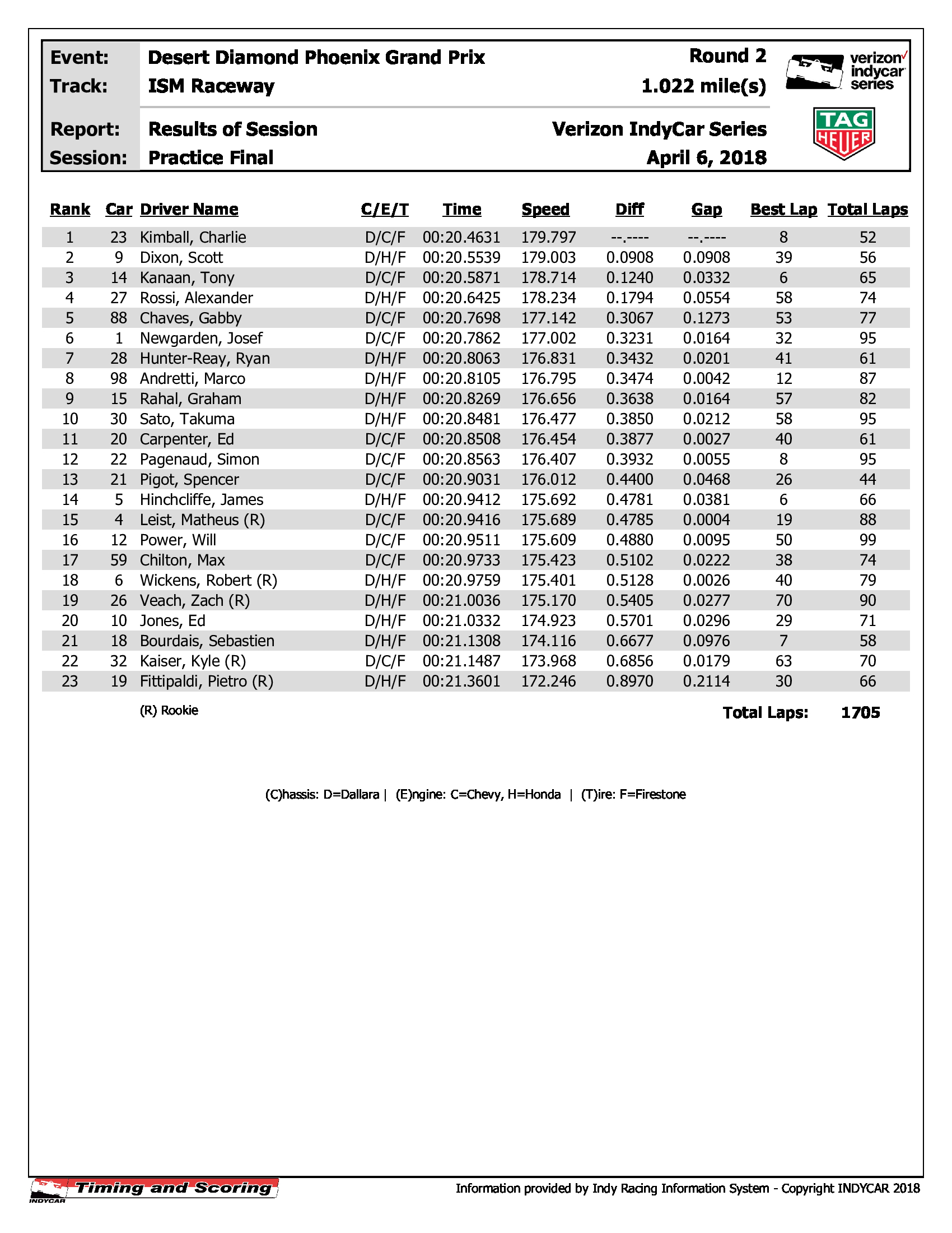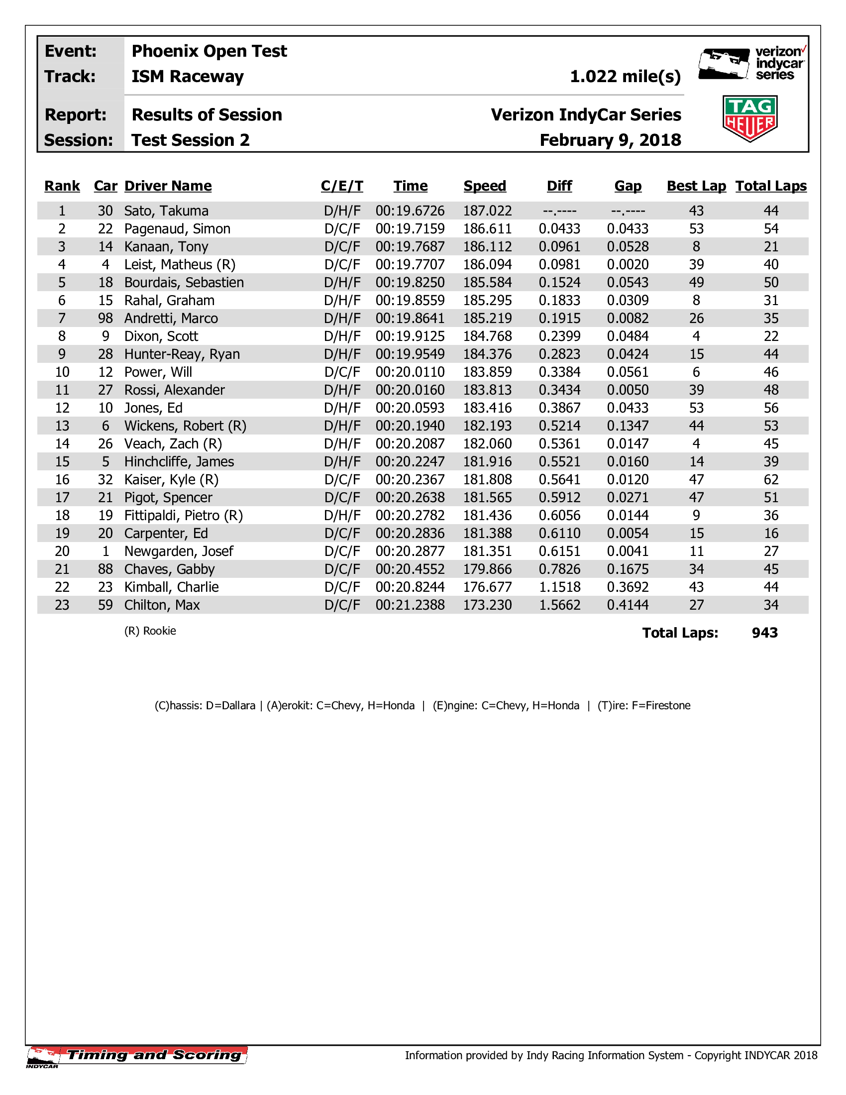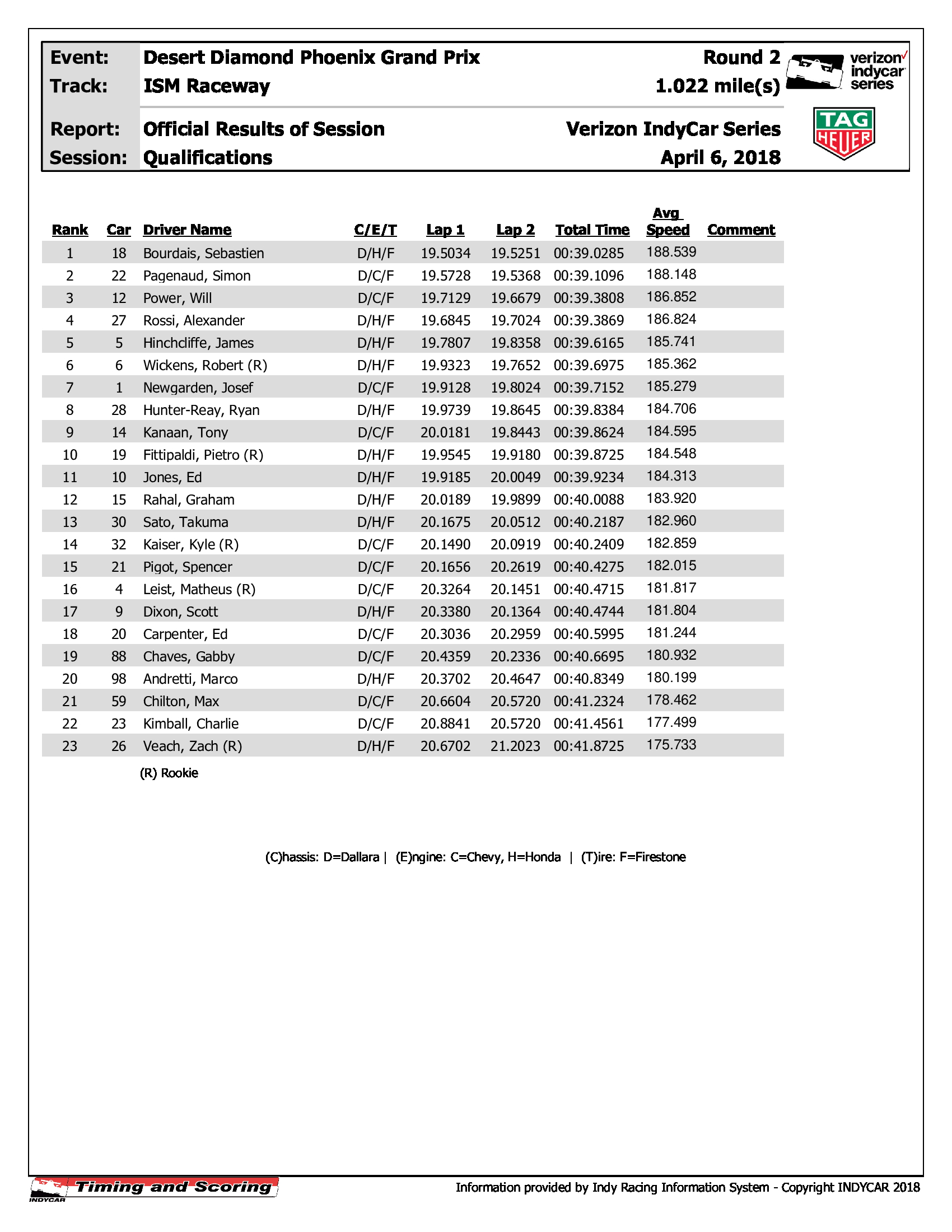 >500 laps into Session 2>Rossi - Chevy - 1st - 20.6370 at 174.444mph. https://www.indycar.com/leaderboard>2018 qualifying times and speeds attached to compare times>two lap average speed