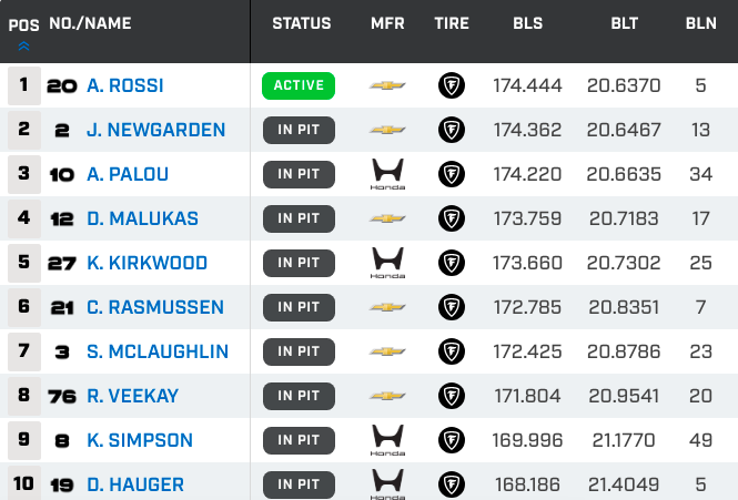 60/40 field for the Chevy's & Hondas in the Top 10. Rahal was strong>20.8569 - Malukas - Chevy20.9277 - Newgarden - Chevy>20.9661 - Power - Honda21.0007 - Kirkwood - Honda>21.0088 - Palou - Honda21.0626 - Armstrong - Honda>21.1157 - Rosenqvist - Honda21.1227 - McLaughlin - Chevy>21.1539 - Dixon - Honda21.1876 - Rossi - Chevy>21.1914 - Rahal - Honda21.1958 - Ericsson - Honda>21.2086 - Veekay - Chevy21.2380 - Rasmussen - Chevy>21.2449 - Foster - Honda21.2509 - O'Ward - Chevy>21.2692 - Hauger - Honda21.3074 - Siegel - Chevy>21.3550 - Robb - Chevy21.4307 - Lundgaard - Chevy>21.4985 - Simpson - Honda21.7895 - Ferrucci - Chevy>21.9504 - Schumacher - Honda22.0550 - Grosjean - Honda>22.1574 - Collet - Chevy