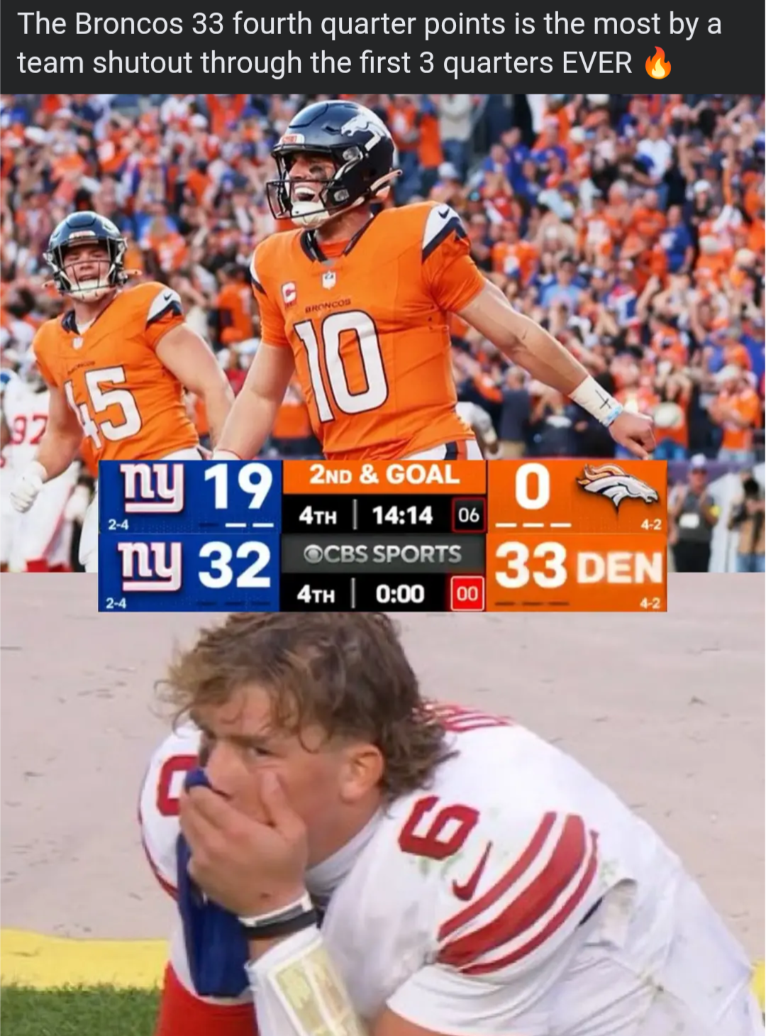 >>153402270It’s a broncos fan. It’s when the broncos got their first win in 8 years against the chiefs. Mahomes supposedly had the flu and spilled spaghetti everywhere that game