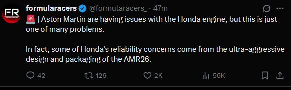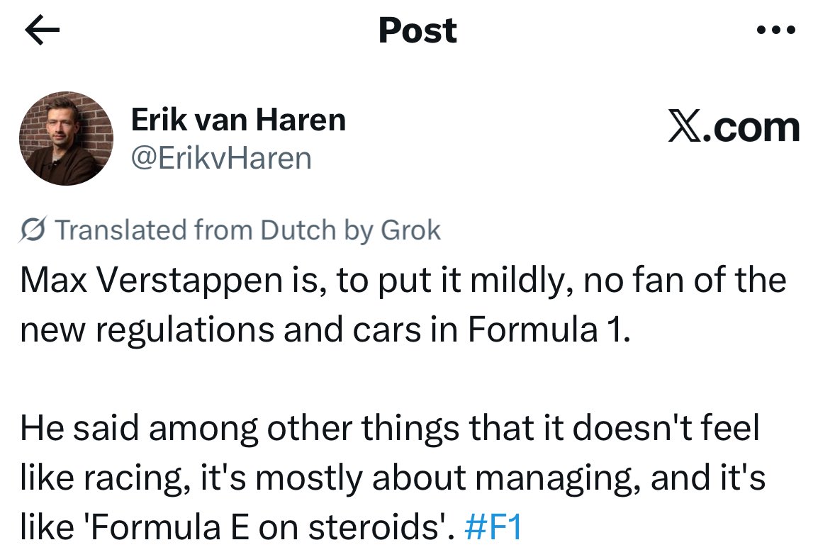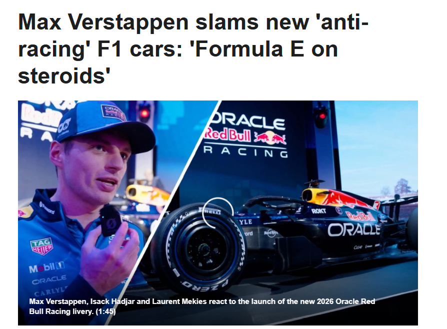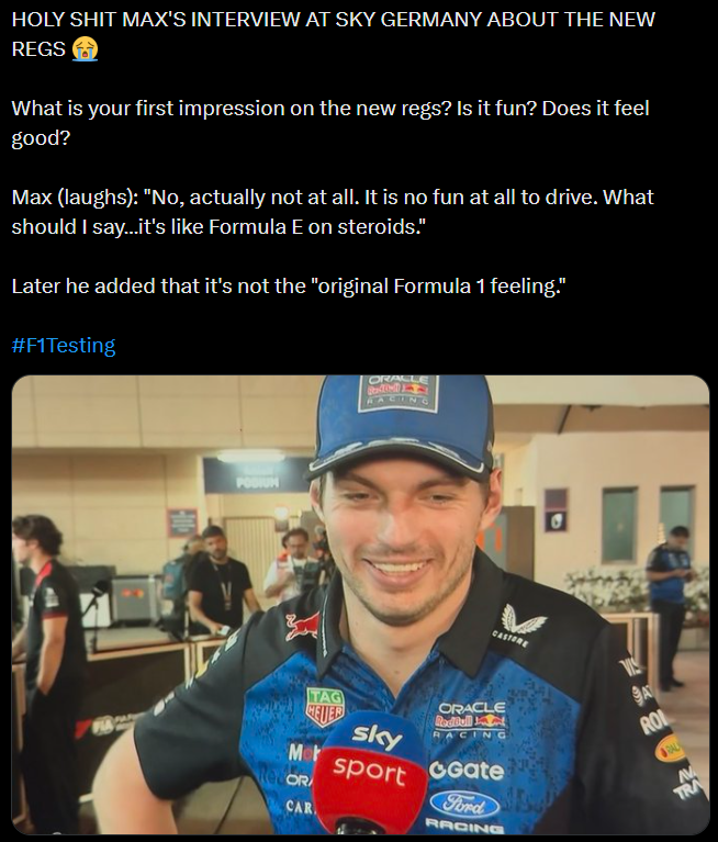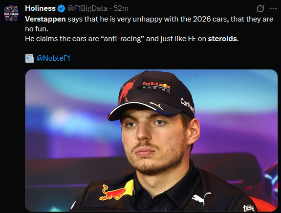 >We’ve just had an astonishing press conference with Max Verstappen.>He is very unhappy with the 2026 cars. >Says they are no fun. He claims the cars are “anti-racing” and just like FE on steroids. >Stories to follow.https://x.com/NobleF1/status/2021977075050328210He's gone