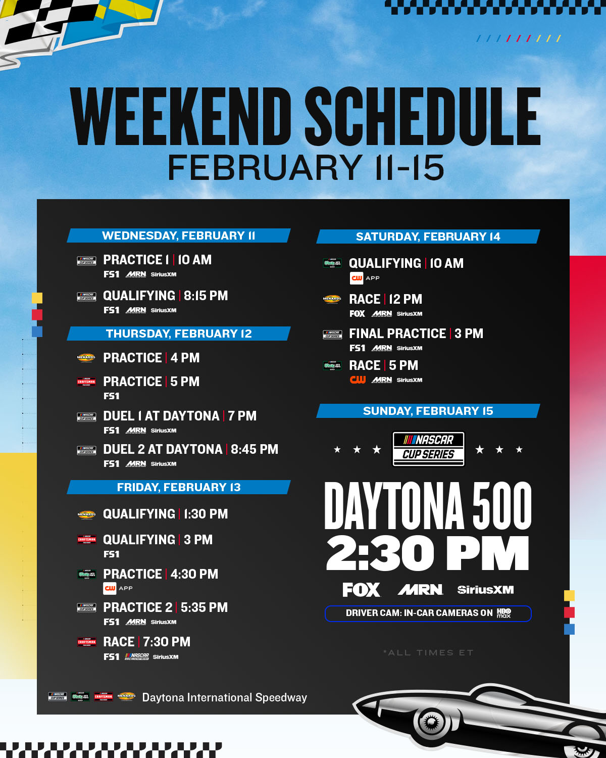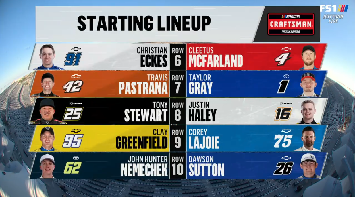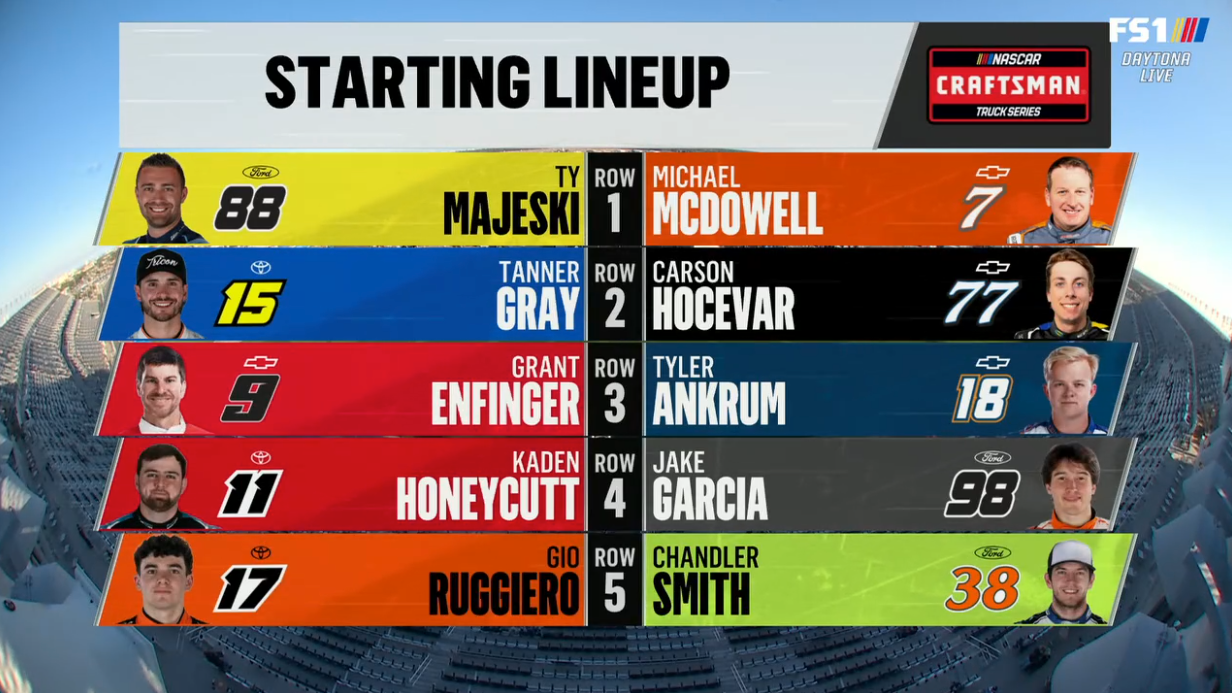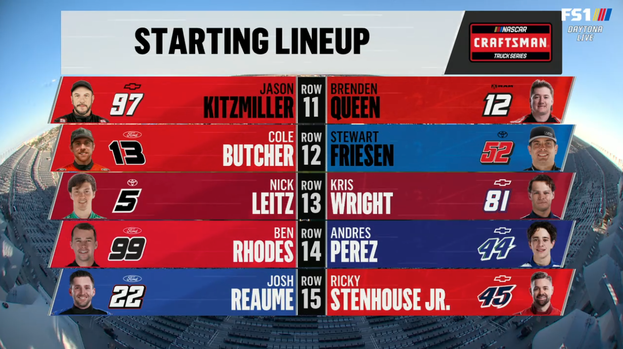 Two 60-lap qualifying races determine where drivers from third place back start in the Daytona 500. Duel 1 sets the inside row and Duel 2 sets the outside row.