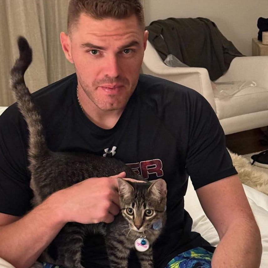 Freddie Freeman playing with a cat