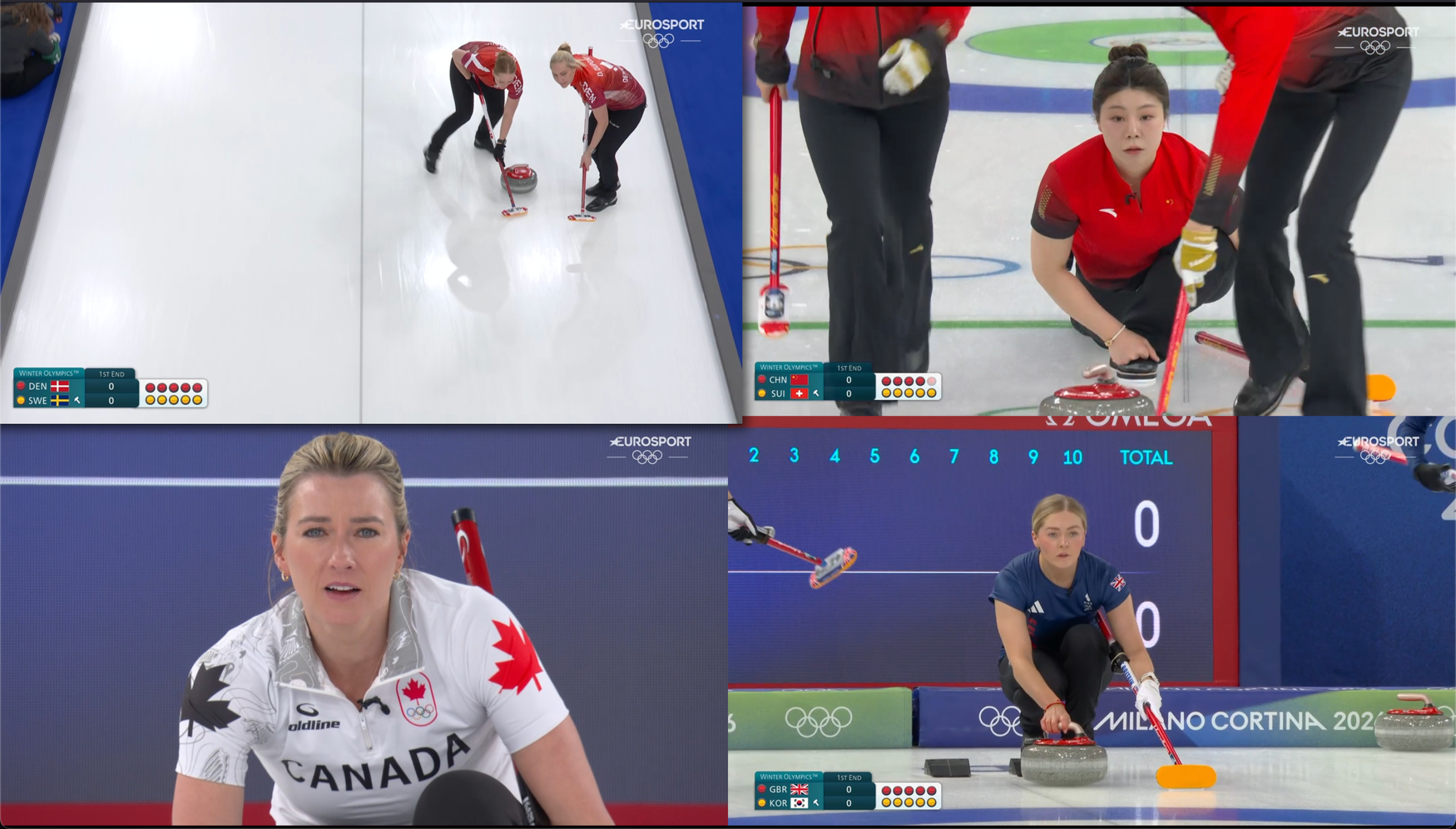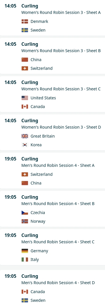 Today's gamesMen's session 3 (live NOW)Canada-USAGB-ItalyChina-NorwaySwitzerland-CzechiaWomen's session 3 (in 5 hours from now)Denmark-SwedenChina-SwitzerlandUSA-CanadaGB-KoreaMen's session 4 (in 10 hours from now)Switzerland-ChinaCzechia-NorwayGermany-ItalyCanada-Sweden