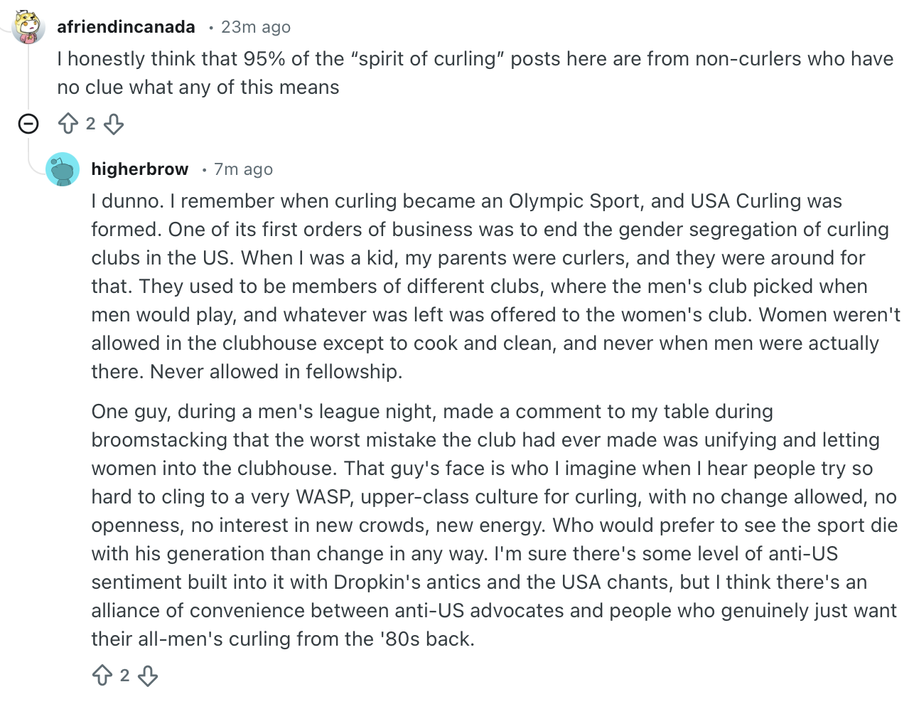 >>153432283Disagree. A huge part of curling is that the players self-police. It's part of the culture of the game and most of the rules and game flow assume honest play.You could reform curling to be like American football where jealous refs scrutinize every aspect play and there are buzzers and players hate each other, but then no one would wants to play it. The only "reform" needed here is for the other teams to collectively request Canada be DQ'd.FFS, India and Pakistan, two countries that are only prevented from mutual mass genocide by their respective nuclear arsenals, can mutually enforce honor rules when they're competing for the literal global cricket cup. Curling can and should do the same.