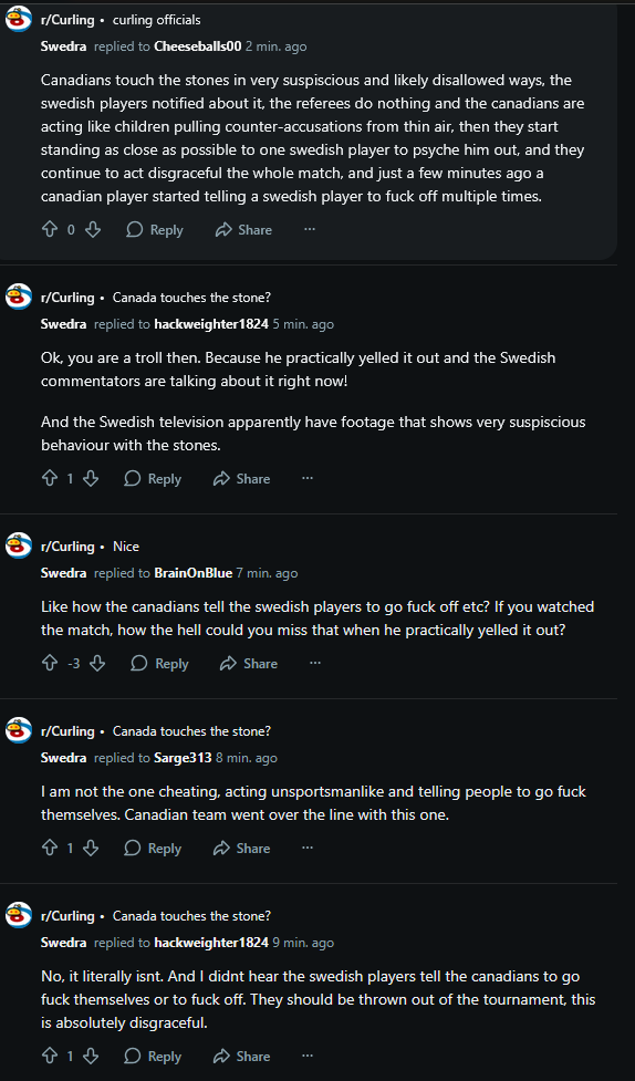If Curling dropped all pretense of gentlemanliness nobody would give a shit about someone telling the opponents to fuck off. They should let us use the broom to try to trip our opponents when they sweep.