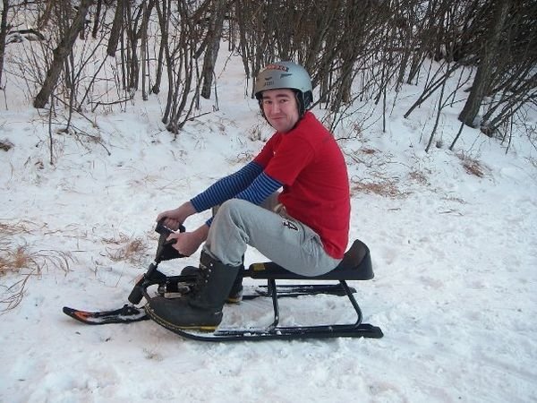 going down on a snow racer with a beer in your hand and dart in your mouth
