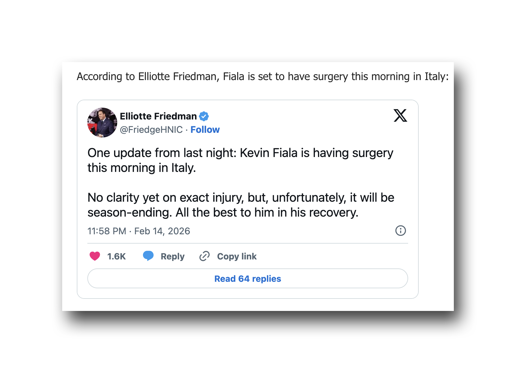 >Fialas injury was season endingGrim. The NHL shouldn’t be sending players to the Olympics. They get literally nothing out of it, can’t even post clips. It doesn’t increase the interest in hockey even a fraction of a percent. And this is the risk that you can’t officiate away.
