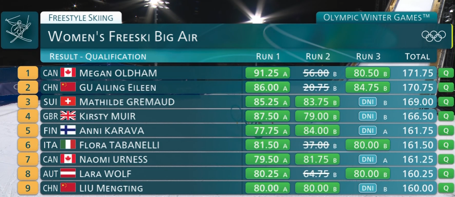 Women's Freeski Big Airhttps://www.olympics.com/en/milano-cortina-2026/results/frs/w/ba----------------/sports-schedule-event>19:30 CET - Women's Freeski BA Qualification Run 1>20:15 CET - Women's Freeski BA Qualification Run 2>21:00 CET - omen's Freeski BA Qualification Run 3