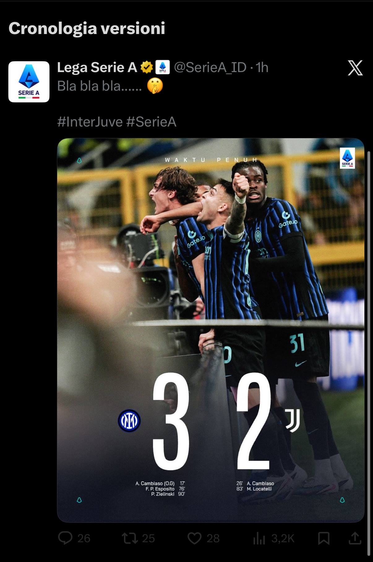 SERIE A MATCHDAY 25>Friday 13th February 202620:45 Pisa 1-2 Bbilan>Saturday 14th February 202615:00 Como 1-2 Fiorentina18:00 Lazio 0-2 Atalanta20:45 Inter 3-2 Juventus>Sunday 15th February 202612:30 Udinese - Sassuolo15:00 Parma - Verona15:00 Cremonese - Genoa18:00 Torino - Bologna20:45 Roma - Napoli20:45 Cagliari - LecceReminder to keep it schizomfy, do NOT take your meds, drink a lot of water, keep iracying serie ass games, look up quien robo and stay aneroxiospilled