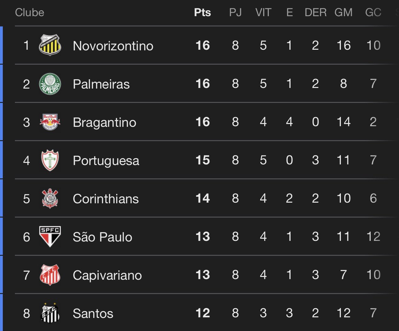 Eliminações dos 4 grandes de SP na 1ª fase do Paulistão desde 2007 (quando o estadual voltou a ter mata-mata): • Santos: 3 (2021, 2022 e 2023)• Corinthians: 3 (2010, 2014 e 2024)• Palmeiras: 1 (2010)• São Paulo: 0 (!)