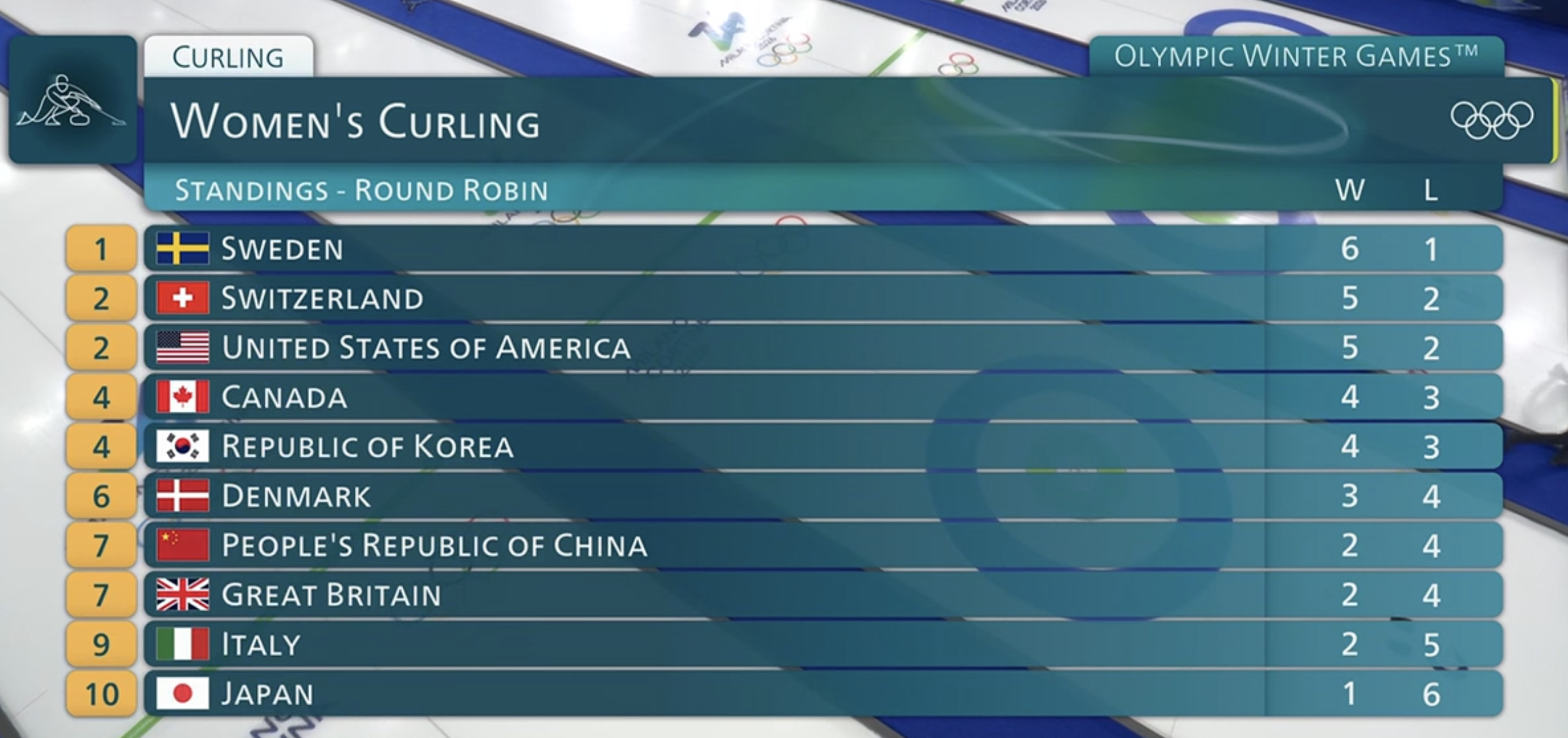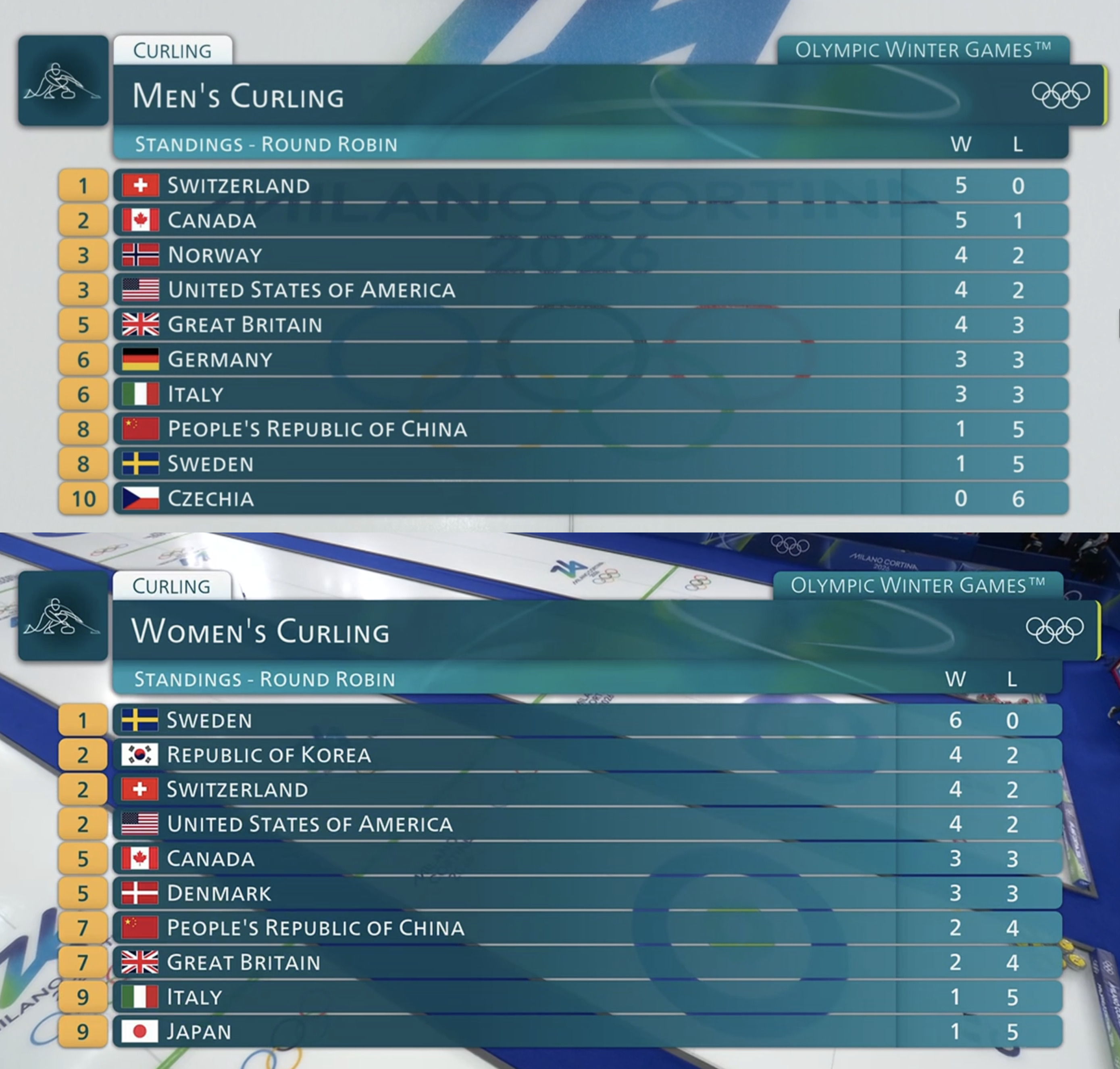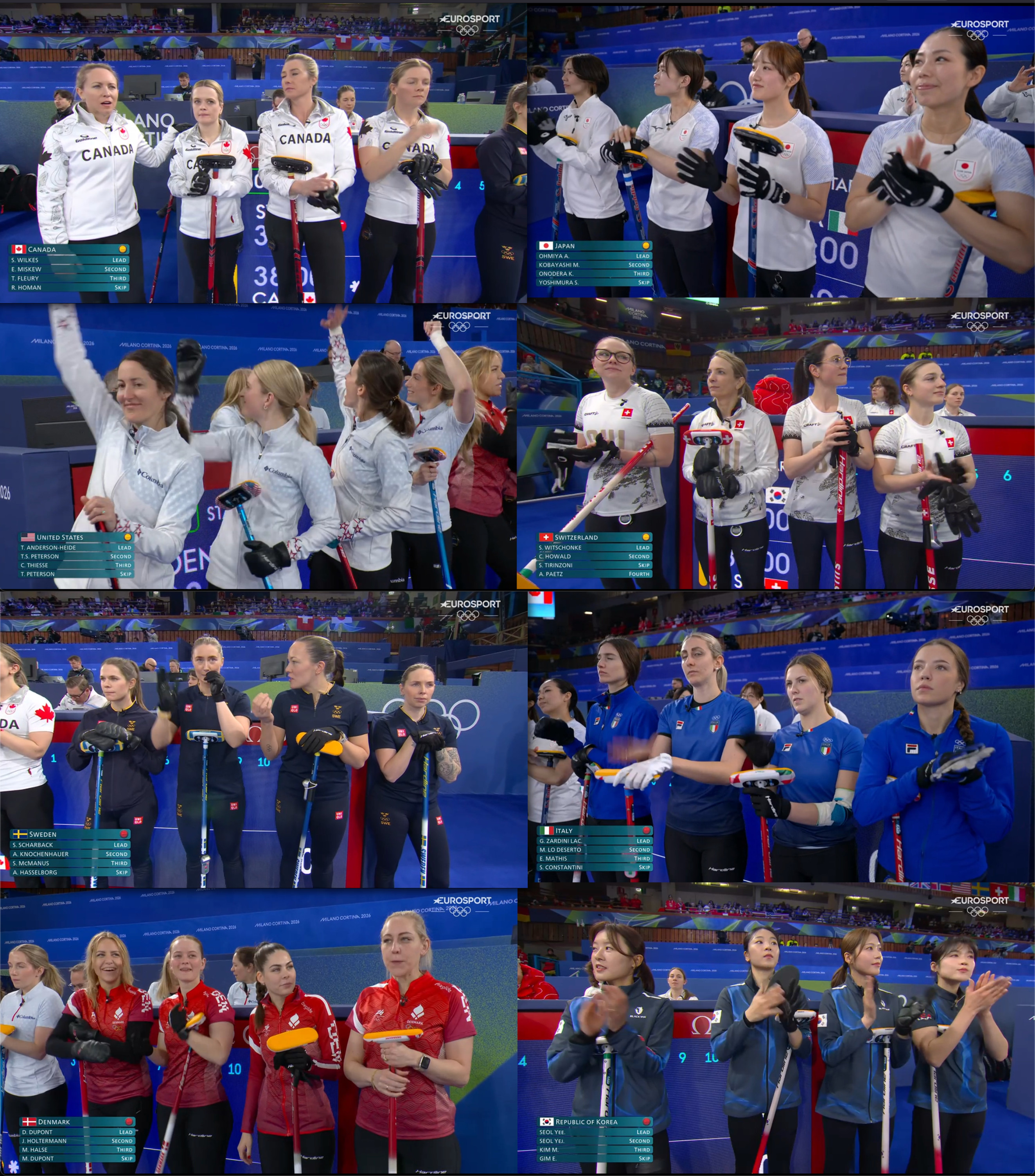 Today's scheduleMen's session 909:05 (NOW)Switzerland-SwedenUSA-ChinaCzechia-Germany14:05Women's session 9Sweden-CanadaItaly-JapanDenmark-USAKorea-Switzerland19:05Men's session 10Germany-SwitzerlandUSA-ItalyCanada-GBSweden-Norway>Watch CBC (Canadian VPN required):https://gem.cbc.ca/collection/olympics-curling>Watch SVT (Swedish VPN required):https://www.svtplay.se/os-2026-curling>Watch YLE (Finnish VPN required):https://arenan.yle.fi/1-76727632>Watch NRK (Norwegian VPN required):https://tv.nrk.no/programmer/ol-curling>Watch ARD (German VPN required):https://www.ardmediathek.de/>Watch RTS (Swiss VPN required):https://www.rts.ch/sport/jo/milan_cortina-2026/epg/Previous: >>153487731